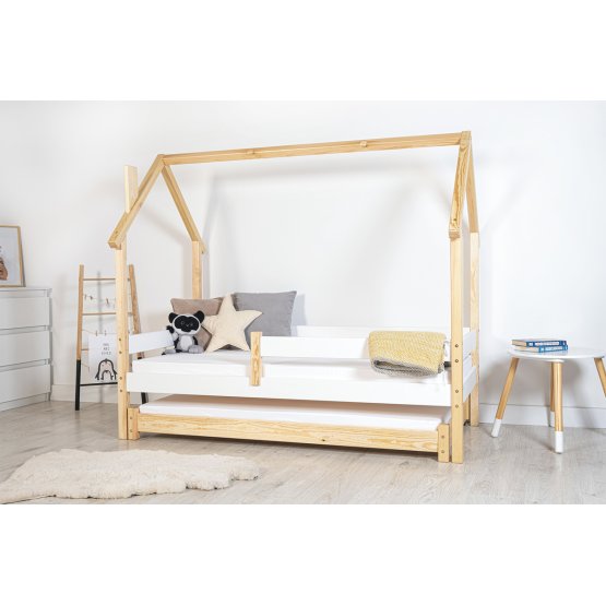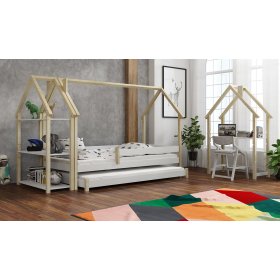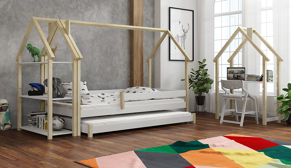 Das Frank SCANDI Bett in Hausform lässt sich um ein ausziehbares Beistellbett erweitern, das Sie tagsüber bequem unter dem Bett verstecken können. Anstelle eines Zustellbettes können Sie auch einen Stauraum wählen.