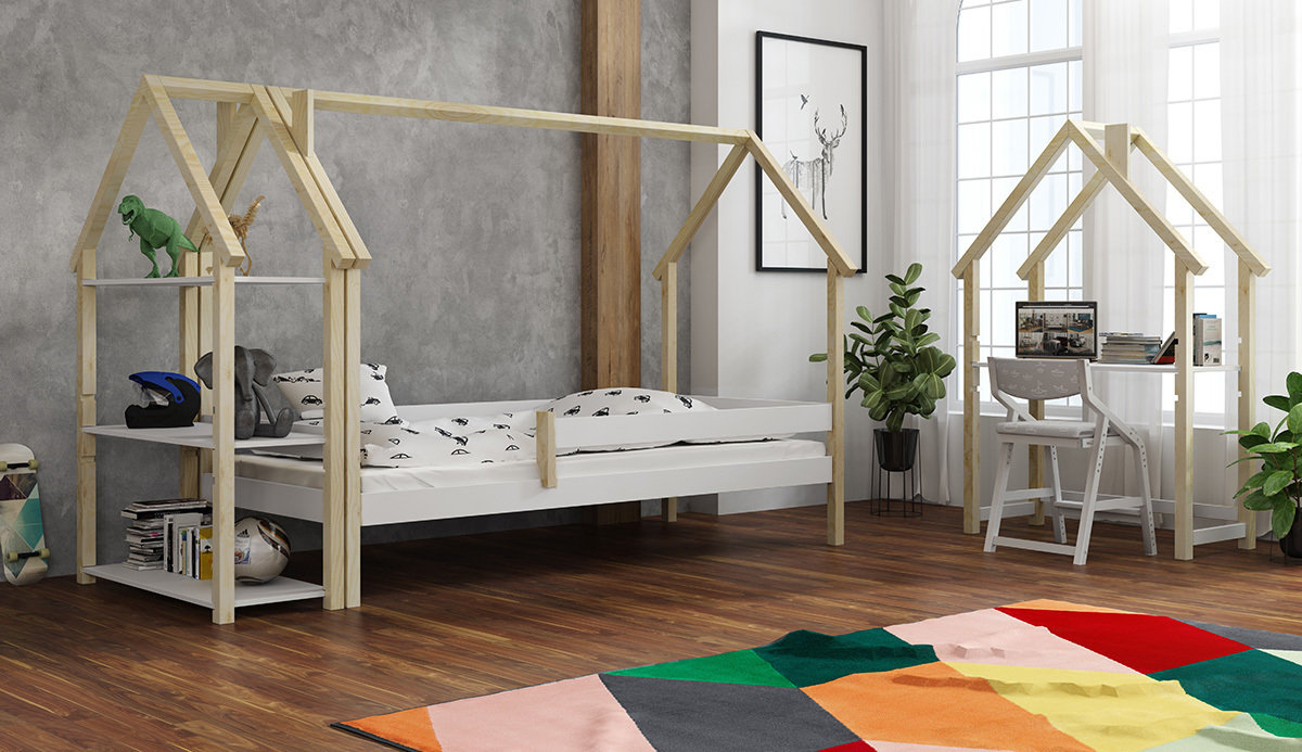 Hausbett Frank kombiniert weißes und natürliches Kiefernholz. Ein ideales Möbelstück für einen Raum im skandinavischen Stil . Es wird Jungen und Mädchen gefallen.