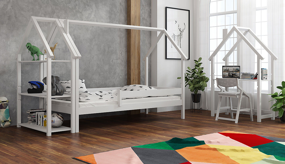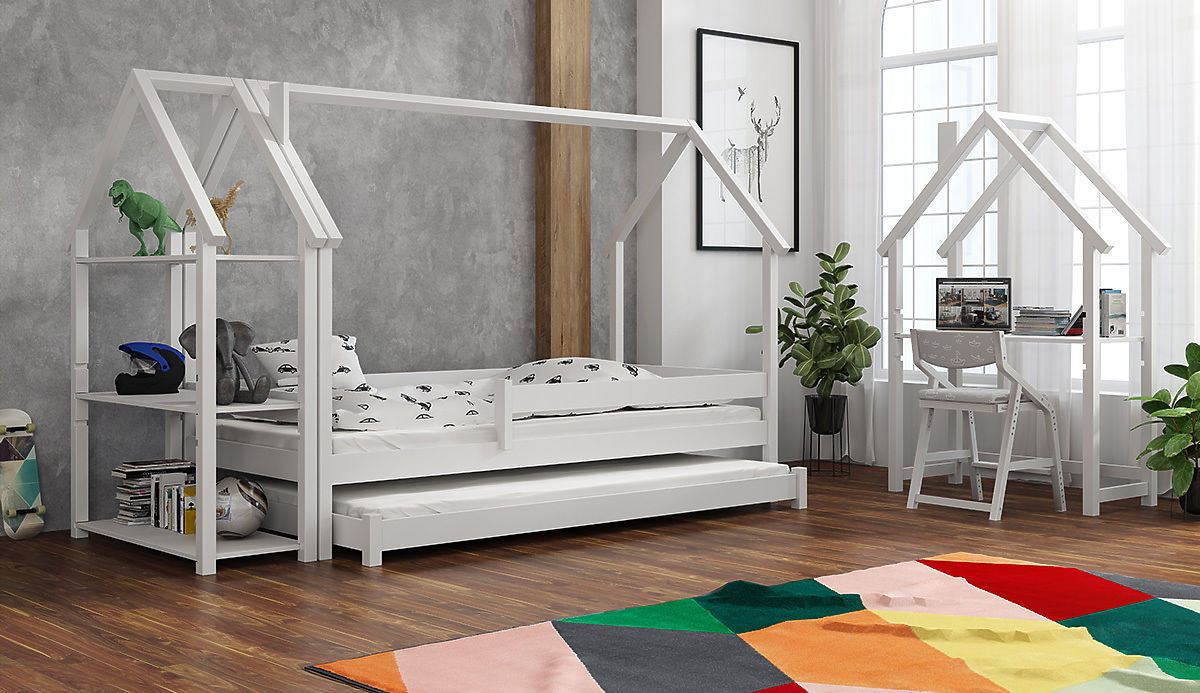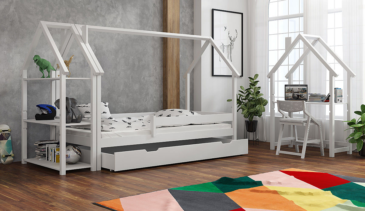 Das stilvolle, weiße Hausbett Frank ist für Mädchen sowie für Jungs perfekt geeignet. Das Kinderbett Frank in Form eines Hauses kann mit einer Schublade oder mit einem ausziehbaren Zustellbett bestellt werden. Der obere Liegeplatz verfügt über einen Rausfallschutz, der an beiden Seiten montiert werden kann.