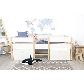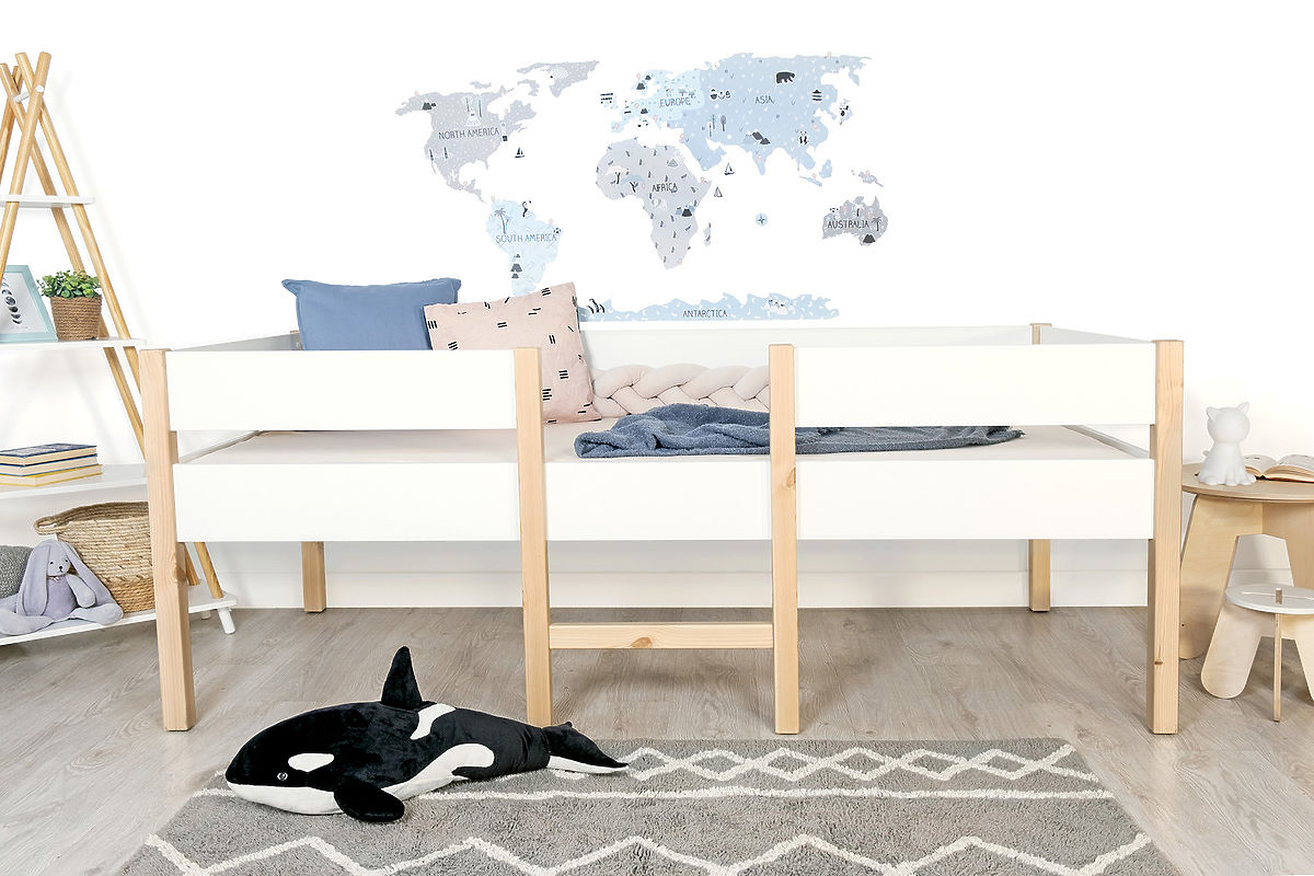 Nutzen Sie den Platz optimal. Dank seiner erhöhten Bauweise bietet das Bett viel praktischen und Stauraum unter dem Bett. Sie können es verwenden, um Bettwäsche, Spielzeug oder Bücher aufzubewahren. Das Bett hat einen Lattenrost aus Massivholz. Es wird ohne Matratze geliefert. Option mit oder ohne Aufbewahrungsboxen.