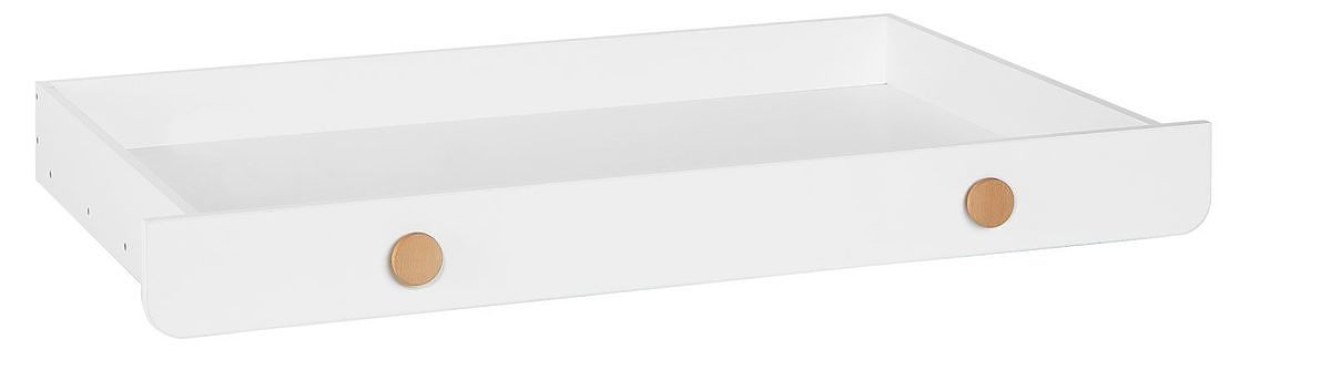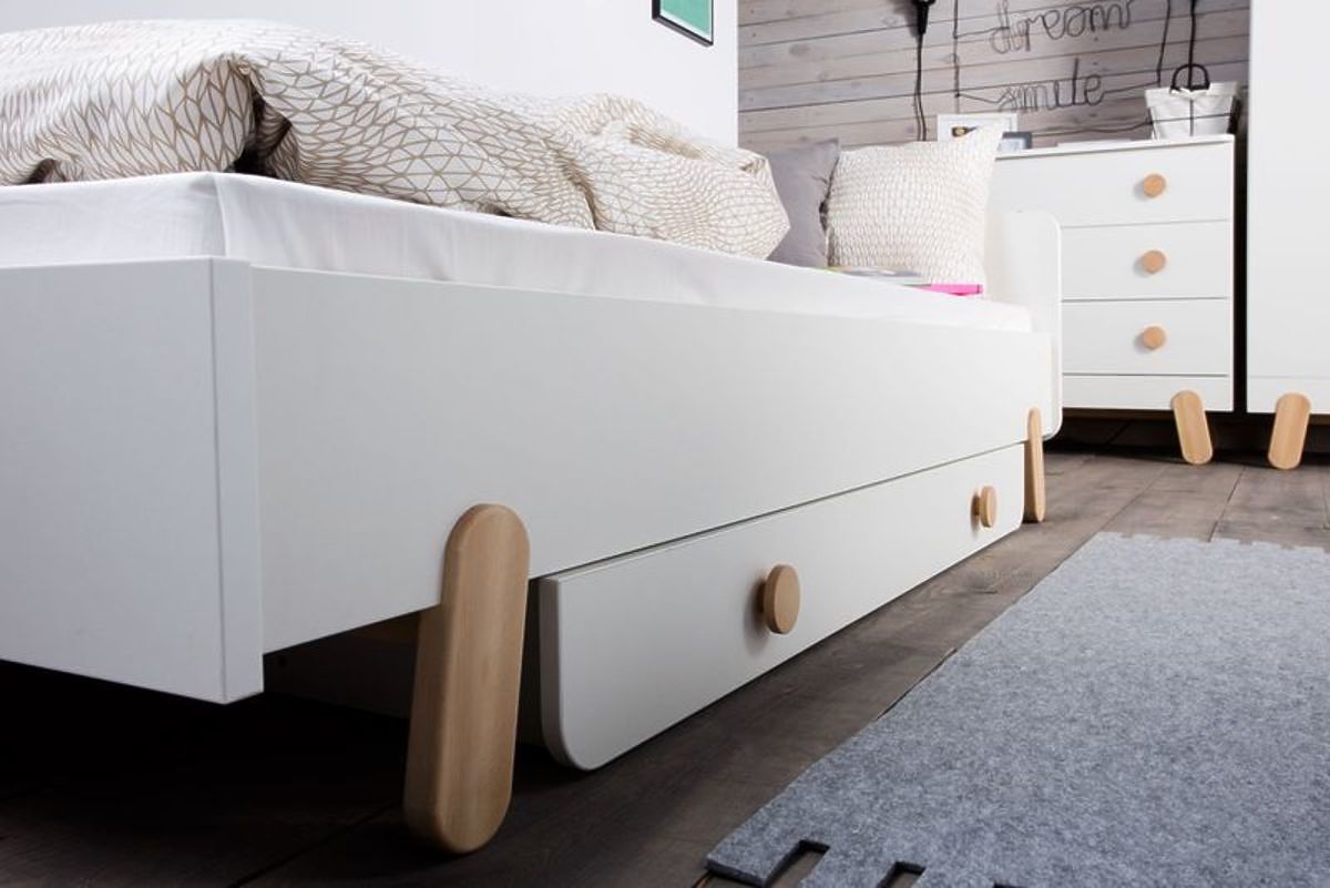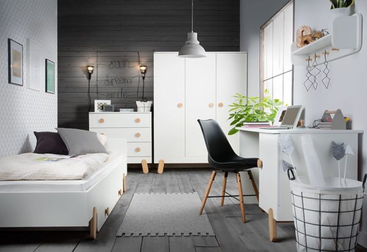 Die weiße Farbe in Kombination mit natürlichen Holzelementen passt perfekt in jedes Mädchen- sowie Jungenzimmer.