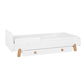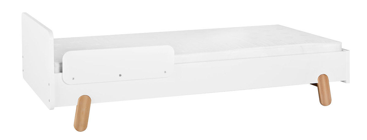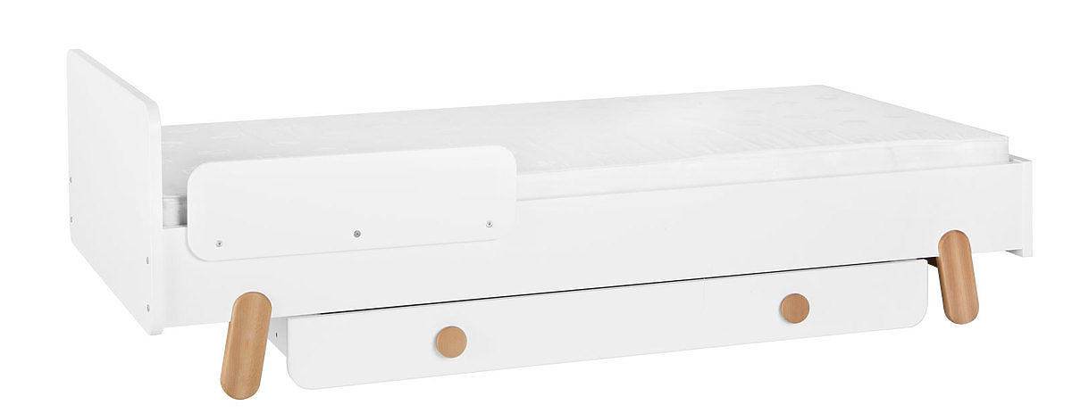 Es ist möglich, zu diesem Bett auch einen Rausfallschutz oder eine Aufbewahrungsbox separat zu bestellen.