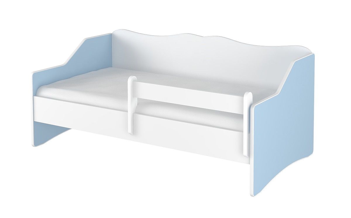 Kinderbett LULU in Form eines Sofas in blauem Design. Dieses spezielle Bettmodell ist als Bett mit Rücken bekannt. Nachts dient das Bett als klassisches Bett, tagsüber als Sofa.
