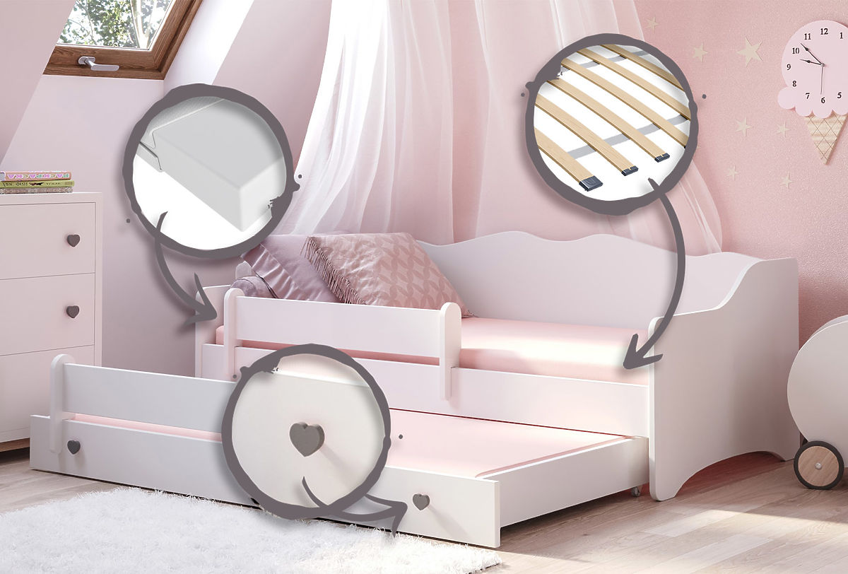 Das Emma-Bett zeichnet sich durch seine Funktionalität aus, die sowohl Kinder als auch ihre Eltern zu schätzen wissen. Dank der stabilen Konstruktion aus zertifizierten Möbelplatten kann das Bett eine Belastung von bis zu 110 kg tragen, was eine langfristige Nutzung gewährleistet. Die Sicherheit des Kindes wird durch abgerundete Kanten und abnehmbare Schutzgitter gewährleistet, die sich leicht an die Bedürfnisse des Kindes anpassen lassen. Der FLEX-Lattenrost mit flexiblen Lamellen garantiert einen bequemen und komfortablen Schlaf. Darüber hinaus kann das untere Bett, auch wenn es nicht zur Aufbewahrung von Gegenständen gedacht ist, einen bequemen und sicheren Schlafplatz für ein zweites Kind bieten, was Platz im Zimmer spart.