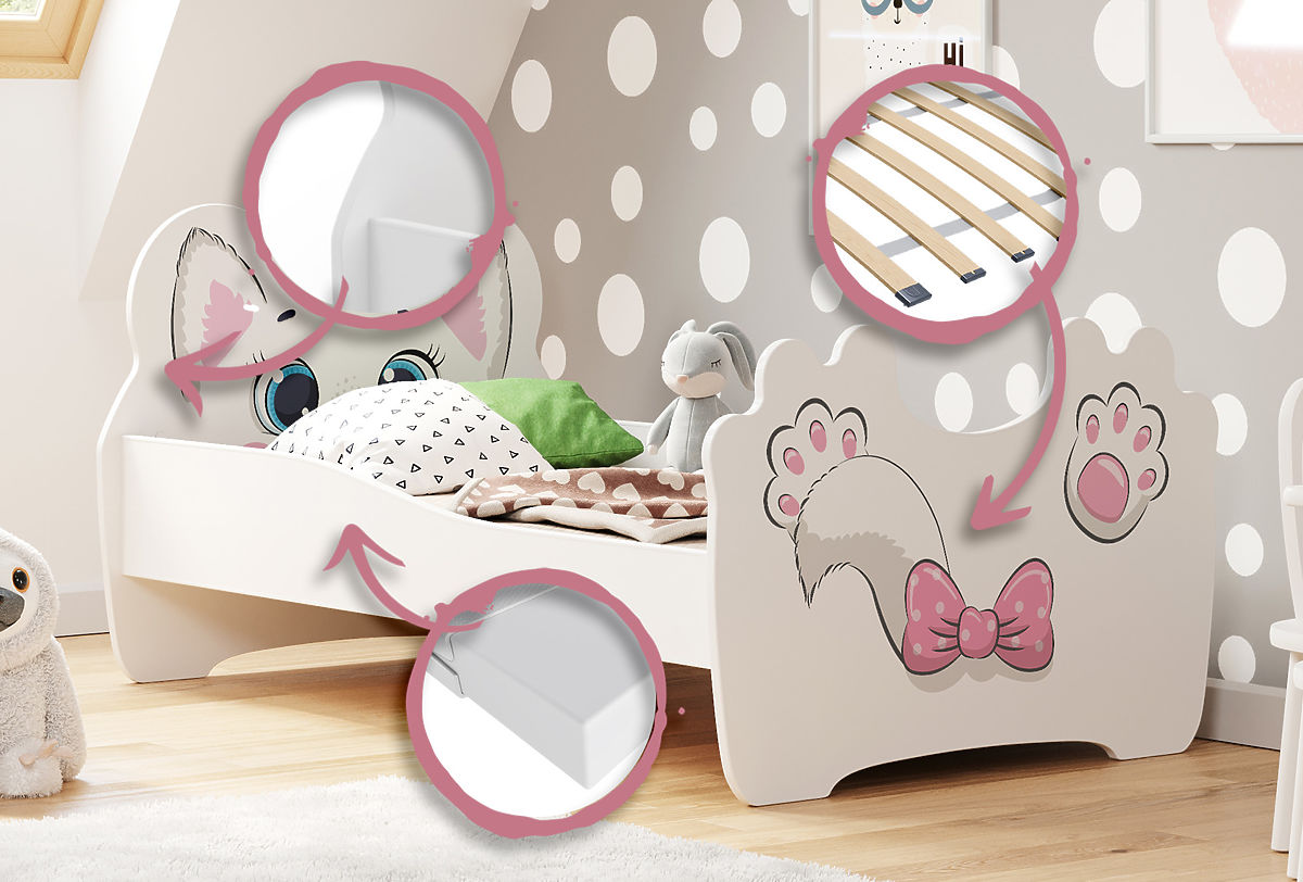Das Kinderbett mit dem niedlichen Druck einer rosa Katze ist die ideale Lösung für kleine Liebhaberinnen von Märchenmotiven. Das niedliche Muster am Kopf- und Fußteil des Bettes macht das Möbelstück nicht nur zu einem Schlafplatz, sondern auch zu einer außergewöhnlichen Dekoration des Kinderzimmers. Sanfte Farben und das Märchenmotiv bringen eine fröhliche Atmosphäre in den Raum, die sowohl Entspannung als auch kreatives Spielen fördert.