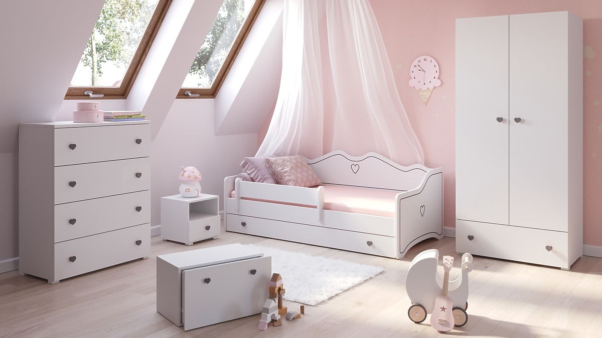 Die Funktionalität des Modells EMMA wird durch eine Reihe praktischer Lösungen hervorgehoben, die den Alltag erleichtern. Das Bett ist mit einer geräumigen Schublade auf Rollen ausgestattet, die ideal zur Aufbewahrung von Bettwäsche, Spielzeug, Spielen oder anderen Gegenständen ist und hilft, Ordnung im Kinderzimmer zu halten. Ein weiterer Vorteil ist das bewegliche Schutzgitter, das an jeder Seite des Bettes montiert werden kann, was seine Vielseitigkeit und Sicherheit erhöht. Die Konstruktion des Bettes trägt eine Belastung von bis zu 110 kg, sodass es viele Jahre dienen kann. Der Einsatz von Federleisten im FLEX-System sorgt für optimale Körperunterstützung, was die Schlafqualität beeinflusst. Zudem ermöglicht das hohe Kopfteil, dass das Bett tagsüber als bequeme Couch dient – ideal zum Lesen, Spielen oder Ausruhen. Diese multifunktionale Lösung bewährt sich sowohl in kleineren als auch in größeren Räumen und erfüllt vollständig die Bedürfnisse von Kindern und ihren Eltern.
