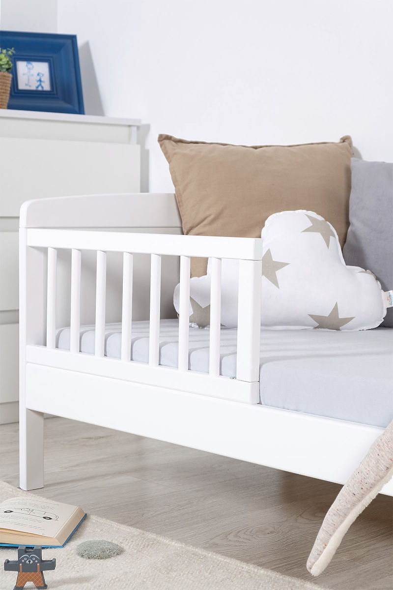 Weißes Kinderbett aus Kiefernholz mit abgerundeten Kanten und beidseitiger Schutzleiste. .. mehr