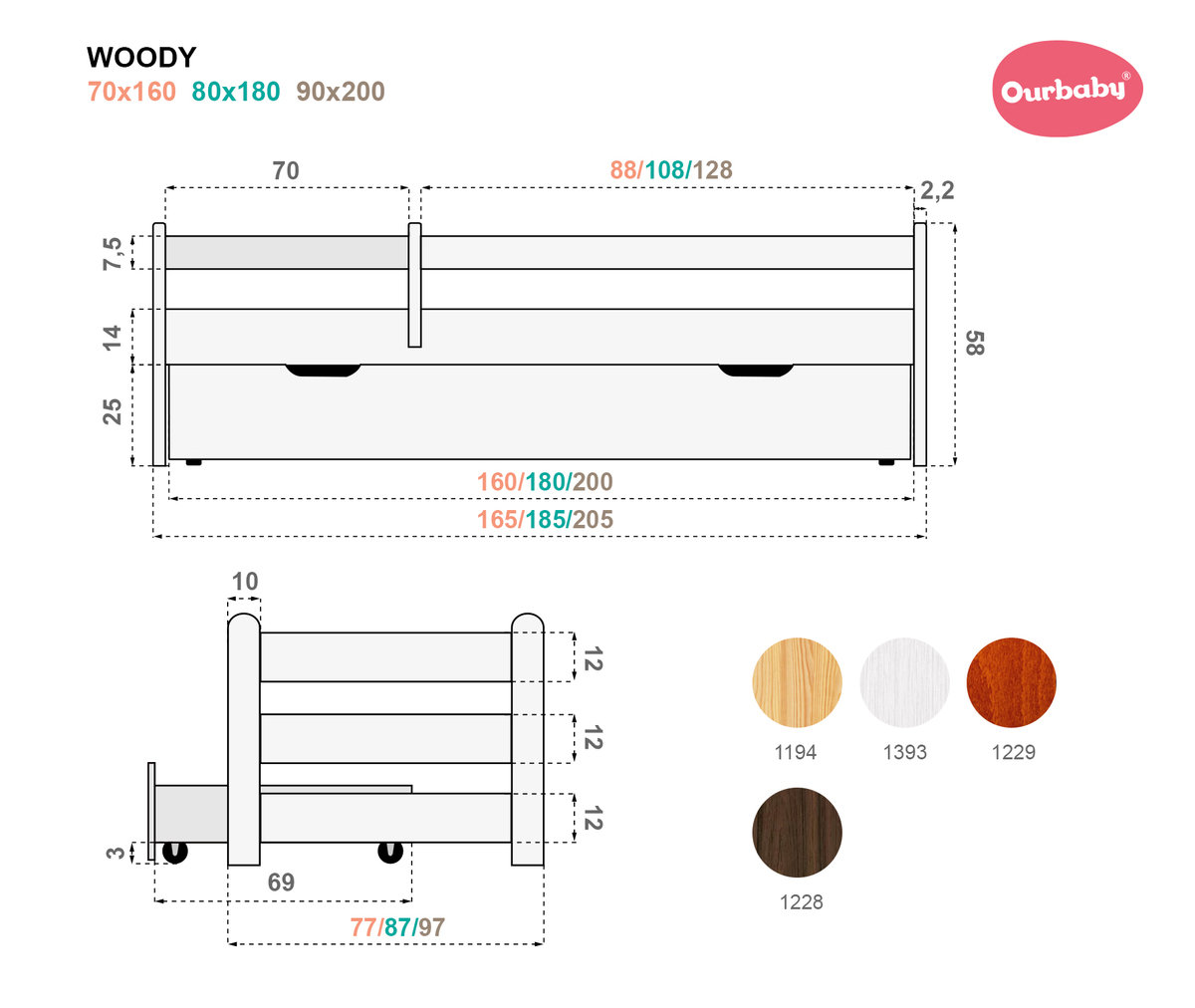 Der Holzlattenrost trägt bis zu 100 kg, sodass Sie sich bedenkenlos an den Rand setzen und Ihrem Kind eine Geschichte vorlesen können. Wählen Sie aus mehreren Größen, je nach Größe des Kindes, für das das Bett bestimmt ist. Die Schublade unter dem Bett ist praktisch, aber Sie können das Bett auch ohne sie kaufen.