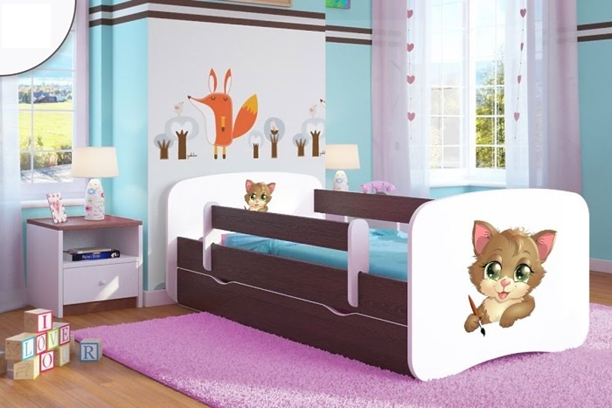 Das Kinderbett in der Farbe Nussbaum hat auf dem Kopf- und Fußteil Aufkleber mit Kätzchen-Motiv. Das Bett passt in jedes Kinderzimmer. Dieses Bett hat gleich mehrere Vorteile, zu welchen auch die Funktionalität, Komfort, schönes Design und einfache Montage gehören.