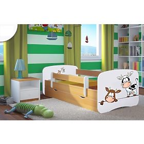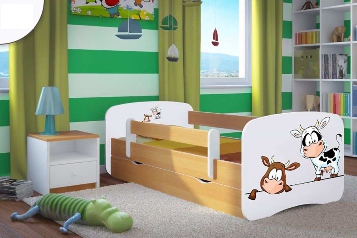 Das Kinderbett in Buche hat auf dem Kopf- und Fußteil Aufkleber mit Kuh-Motiv. Das Bett passt in jedes Kinderzimmer. Dieses Bett hat gleich mehrere Vorteile, zu welchen gehören auch die Funktionalität, Komfort, schönes Design und einfache Montage.