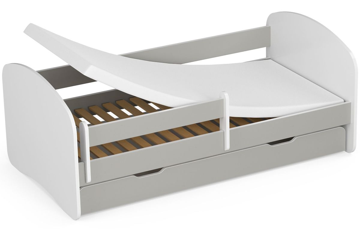 Bett SMILE mit den Maßen 160x80 cm mit Matratze, Schublade und Schutz. Komplettes Bett für Jungen oder Mädchen im Kinderzimmer. Farbe Grau. Der Rahmen trägt eine Belastung von bis zu 100 kg.