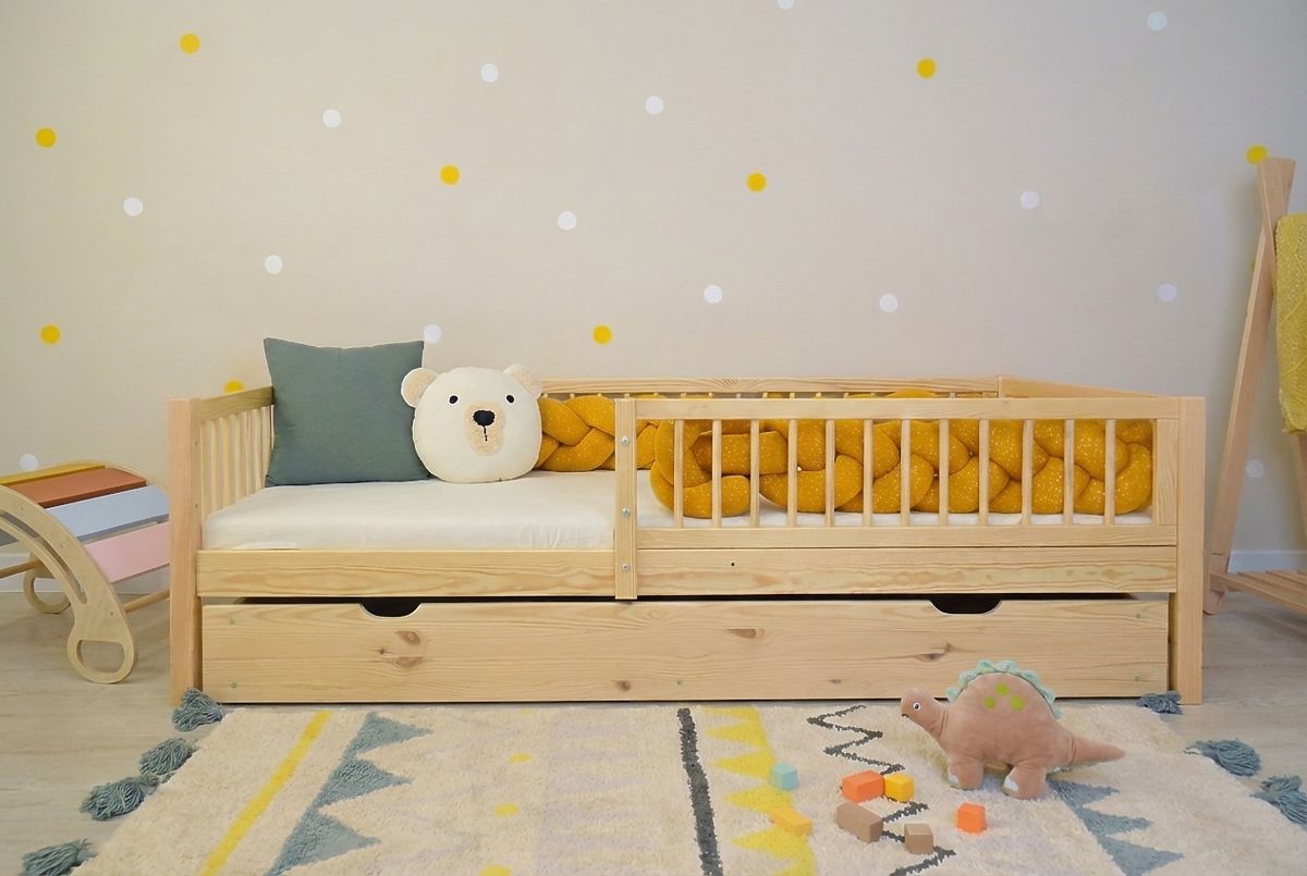 Das hochwertige Kinderbett Teddy Plus in naturfarbener Ausführung ist die ideale Wahl für jedes Kinderzimmer. Es ist aus massivem Kiefernholz gefertigt, das Festigkeit, Stabilität und lange Lebensdauer gewährleistet. Die natürliche Oberfläche ist mit einem zertifizierten, farblosen Lack lackiert. Dank des durchdachten Designs bietet das Bett nicht nur komfortablen Schlaf, sondern auch Sicherheit und praktischen Stauraum unter dem Bett.