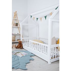 Weißes Montessori Hausbett Elis mit sicherer Höhe und Barriere für Kinder bis 30 kg. .. mehr