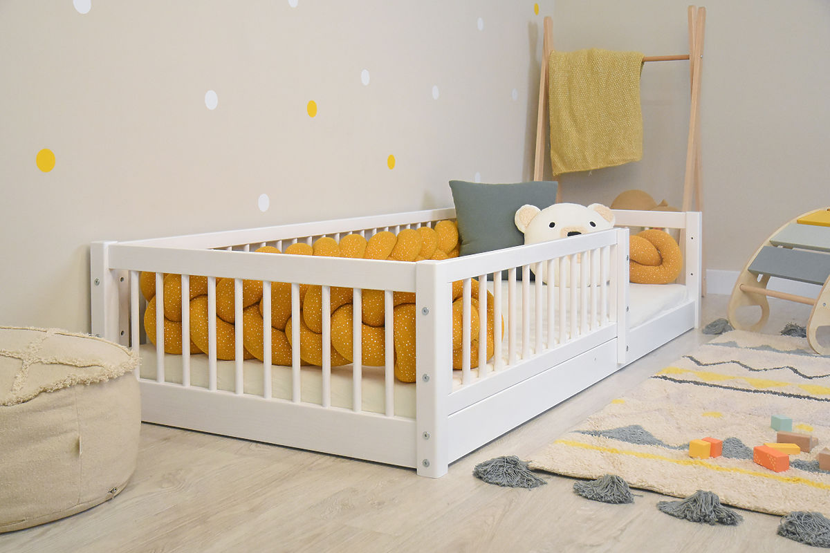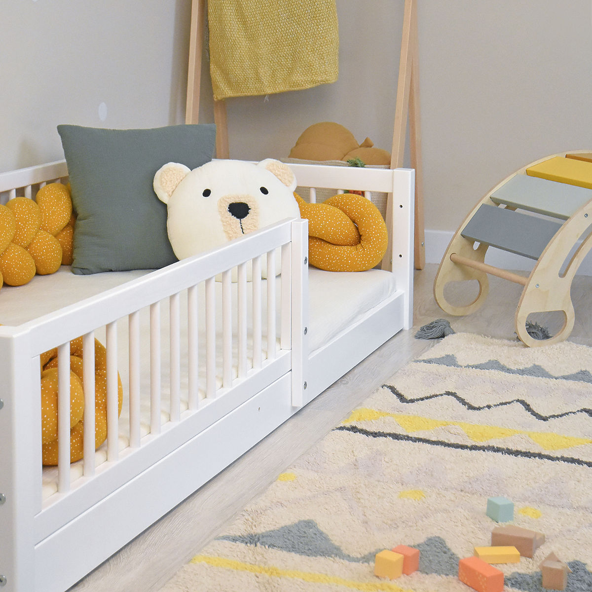 Montessori-Bett in elegantem Weiß ist unter Berücksichtigung der Bedürfnisse kleiner Kinder und der Prinzipien der Montessori-Pädagogik entworfen. Dank der niedrigen Konstruktion ermöglicht es dem Kind einen selbstständigen und sicheren Zugang zum Bett ohne Hilfe von Erwachsenen, was seine Unabhängigkeit und Selbstvertrauen fördert.