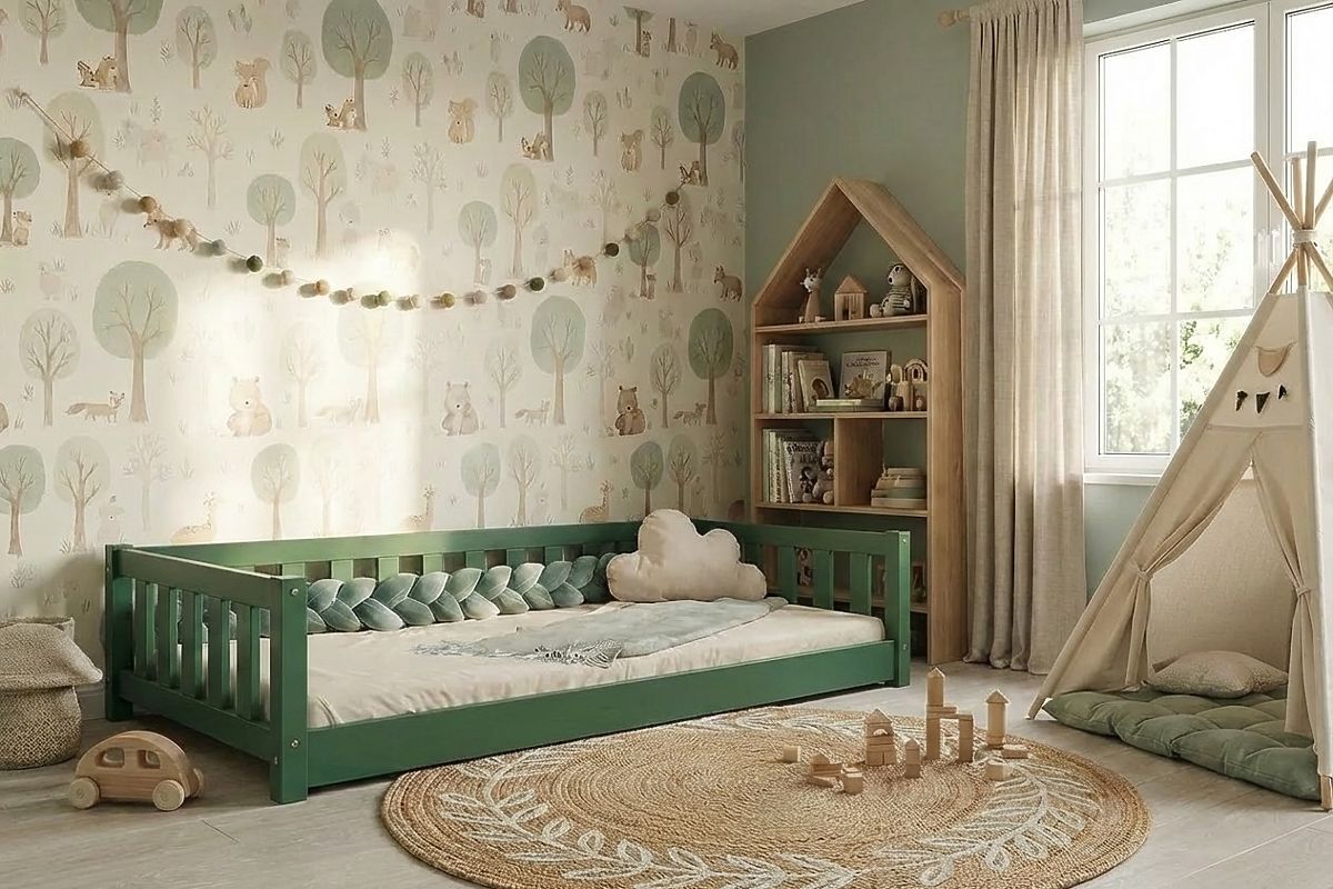 Niedriges Kinderbett Montessori Meadow in Grün mit Rausfallschutz. .. mehr