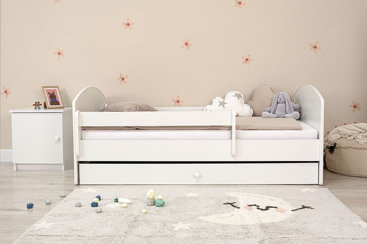 Das Kinderbett ist außerdem sehr praktisch und es besteht die Möglichkeit , ein Bett mit oder ohne Stauraum zu wählen. Das Bett verfügt über eine abnehmbare Barriere und einen Lattenrost. Die Abstützung des Rostes erfolgt durch den Mittelsteg. Dank der Sicherheitsbarriere ist es auch für die Kleinsten geeignet. Später, wenn die Kinder erwachsen sind, besteht die Möglichkeit, die Barriere einfach zu entfernen.