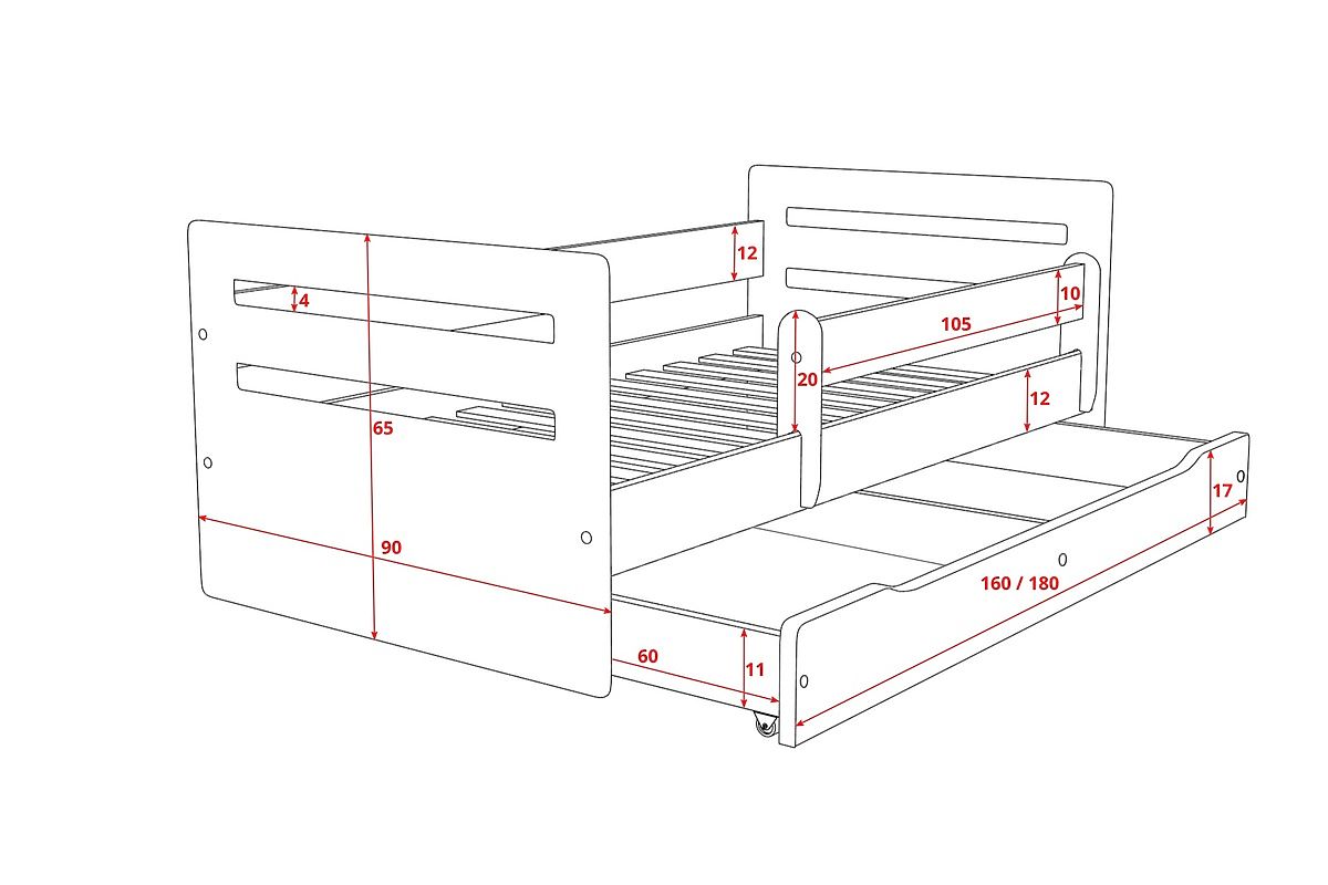 Es ist aus hochwertigem Laminatmaterial gefertigt. Die Stirnseiten sind zusätzlich 3-fach mit umweltfreundlichen, gesundheitlich unbedenklichen Lacken lackiert. Das Bett ist sehr stabil und hat eine Tragfähigkeit von bis zu 150 kg. Die Sicherheit wird durch abgerundete Kanten gewährleistet. Der Lattenrost ist aus Kiefernholz gefertigt, die Leisten sorgen für die richtige Unterstützung und Belüftung der Matratze. Im Preis inbegriffen sind Bett, Lattenrost und Schutzgitter. Die Matratze ist nicht im Lieferumfang enthalten und muss in der entsprechenden Größe in der Kategorie Matratzen nachbestellt werden.