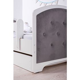 Gepolstertes Kinderbett mit dunkelgrauen Kopf- und Fußteilen. Das Bett beinhaltet zwei Rausfallschutze, einen Stauraum und einen Lattenrost aus massivem Kiefernholz.