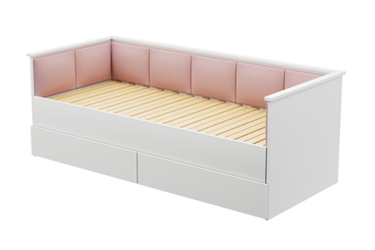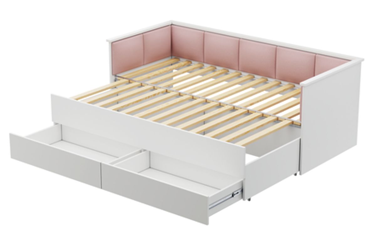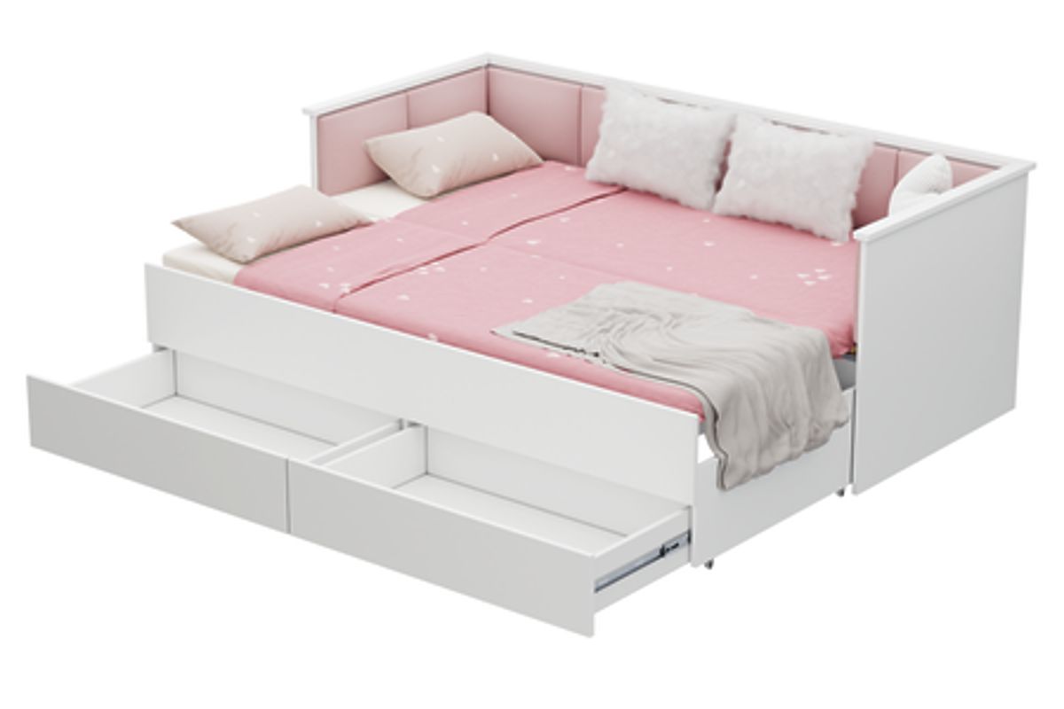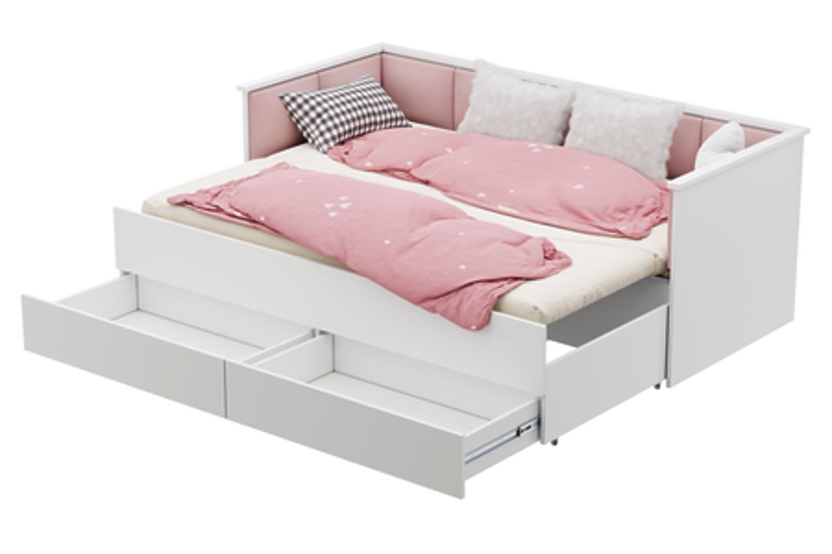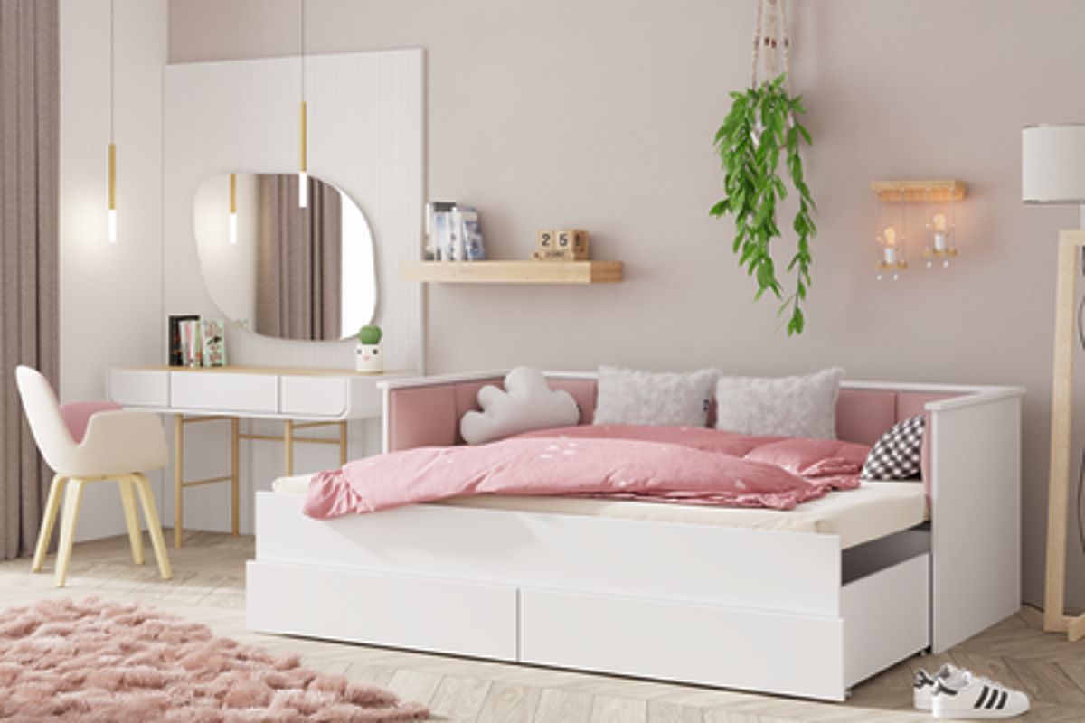 Ausziehbares Jugendbett HELIOS mit rosa Samt-Paneelen und geräumigen Schubladen. .. mehr