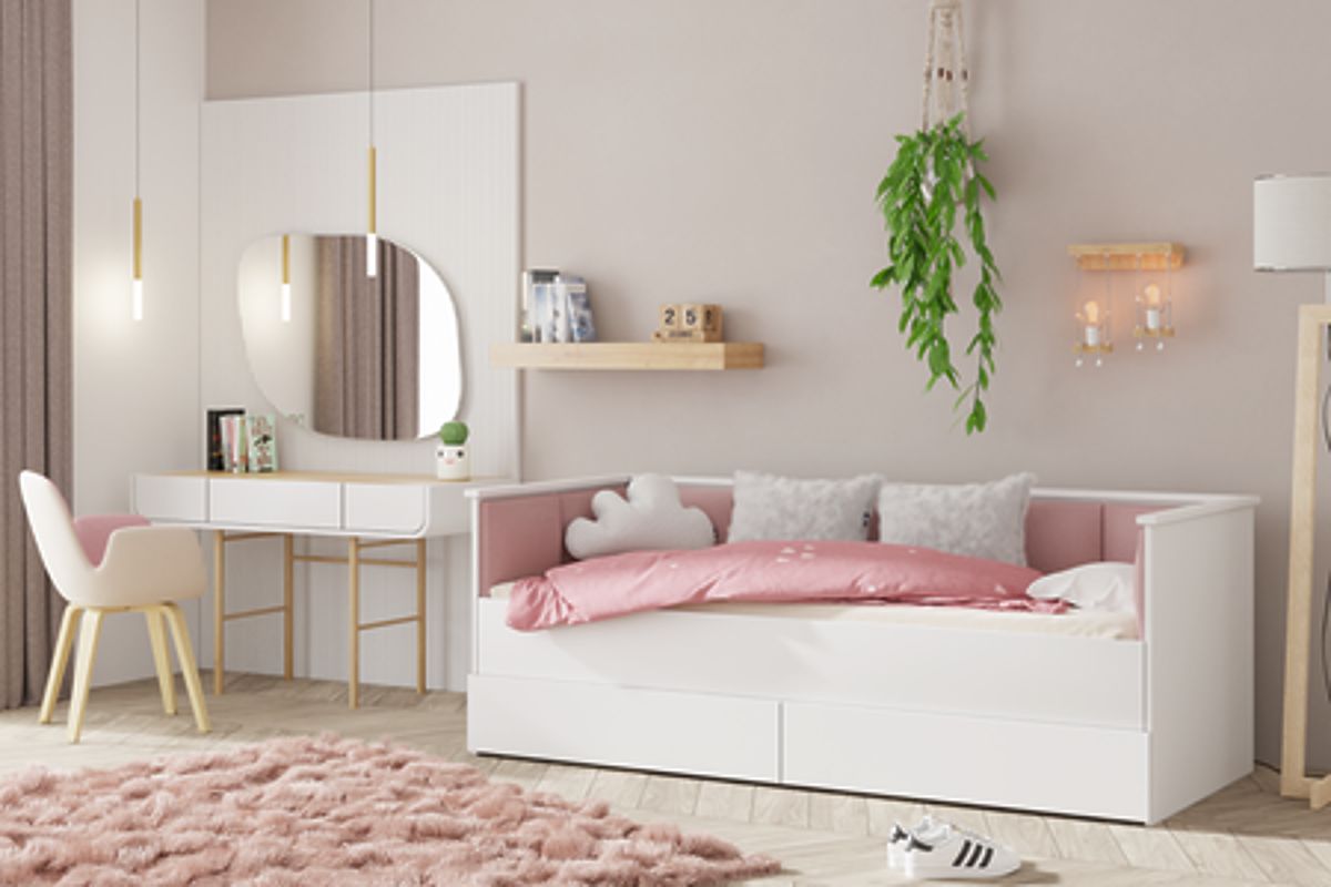 Das minimalistische Design des HELIOS Bettes, bereichert mit gepolsterten Paneelen aus hochwertigem Samtmaterial, verleiht dem Interieur einen modernen und eleganten Charakter. Die Paneele sind nicht nur ein ästhetisches Accessoire, sondern auch ein praktisches Element, das beim Lesen, Fernsehen oder Lernen bequemen Halt bietet. Das weiche und angenehme Material vermittelt Wärme und Gemütlichkeit und unterstreicht den freundlichen Charakter des Jugendzimmers. Zudem ist das Bett mit zwei geräumigen Schubladen auf Kugellagern ausgestattet, die das Verstauen von Bettwäsche, Kleidung oder anderen Kleinigkeiten ermöglichen. Diese Lösung hilft nicht nur, Ordnung zu halten, sondern nutzt auch den Raum optimal aus, was besonders in kleineren Zimmern wichtig ist.