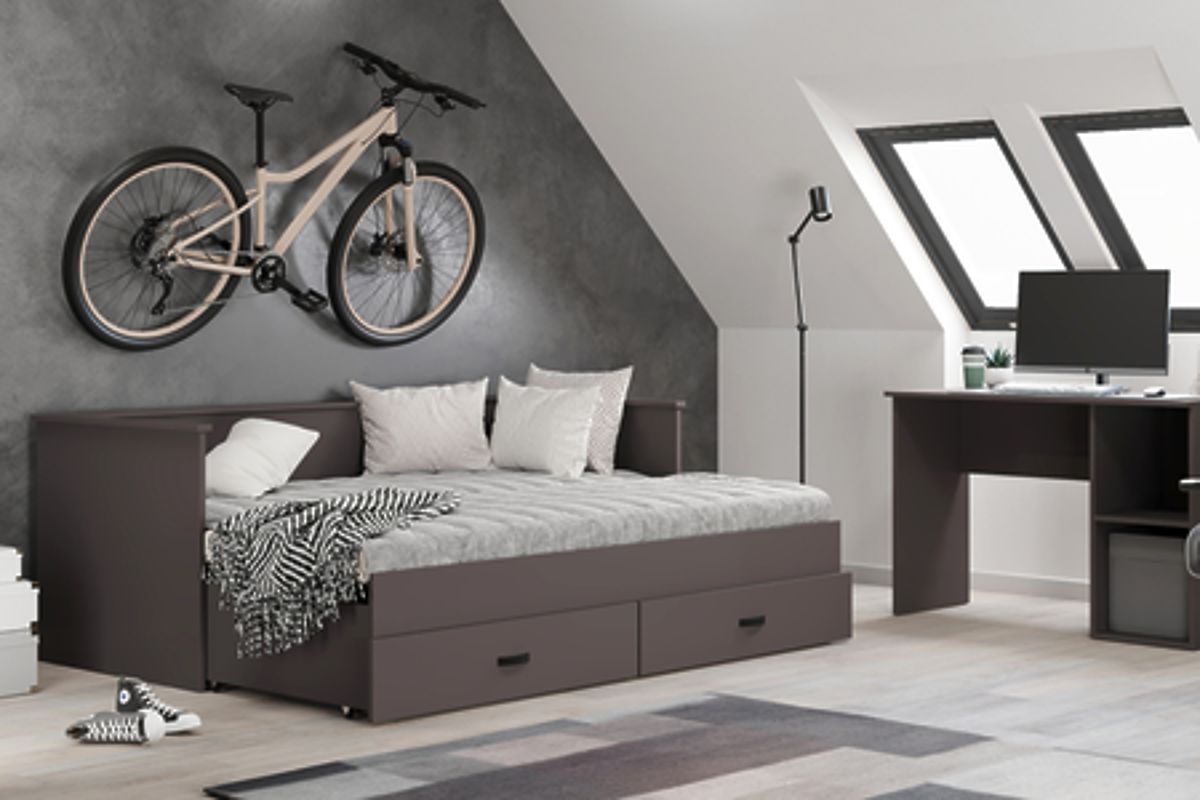 Das Bett HELIOS ist ein modernes, ausziehbares Bett für Jugendliche, das Ästhetik mit praktischen Funktionen verbindet. Dank der Möglichkeit, es schnell zu einem Doppelbett auszuziehen, indem die untere Basis herausgezogen wird, eignet sich dieses Möbelstück sowohl für kleine als auch geräumige Zimmer. Sein universelles Design in Grau passt sich jedem Einrichtungsstil an und verleiht ihm Frische und Eleganz.