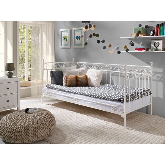 Schön zdobová in weißem Metallbett, die mit dekorativen Elementen wie ein Herz auf der Seite des Bettes und geschmiedeten Teil des „S“ -Form .Originální Bett geschmückt ist - Couch - bildet die Runde endet postele.Pohovka die perfekte Ergänzung zu Räumen für Kinder / Jugendliche im Wohnzimmer und sicherlich wird seine Verwendung im Sommergarten oder Terrasse.