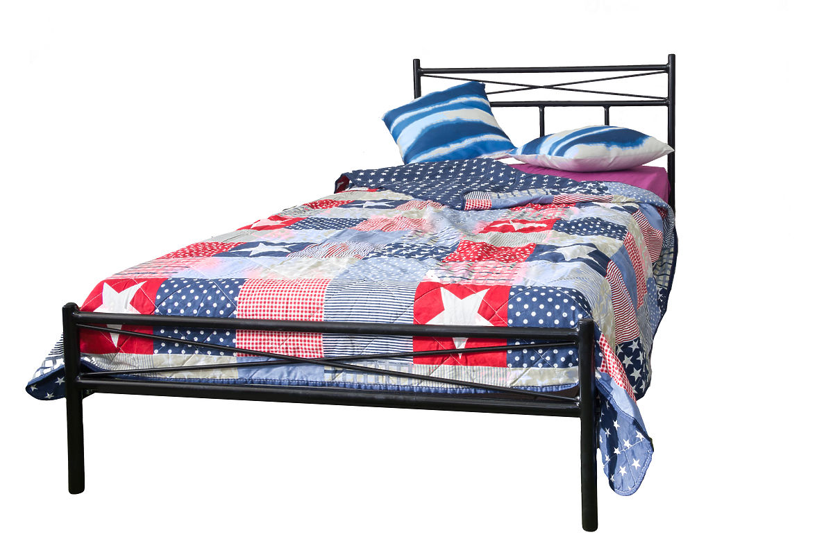 Moderne Metall Bett mit robusten Konstruktion und minimalistisches Design. Das Bett hat einen schönen Head, geometrische Design, das in die Kind oder Schüler Räume passt. Seine Anwendung findet jedoch auch in das eheliche Schlafzimmer.