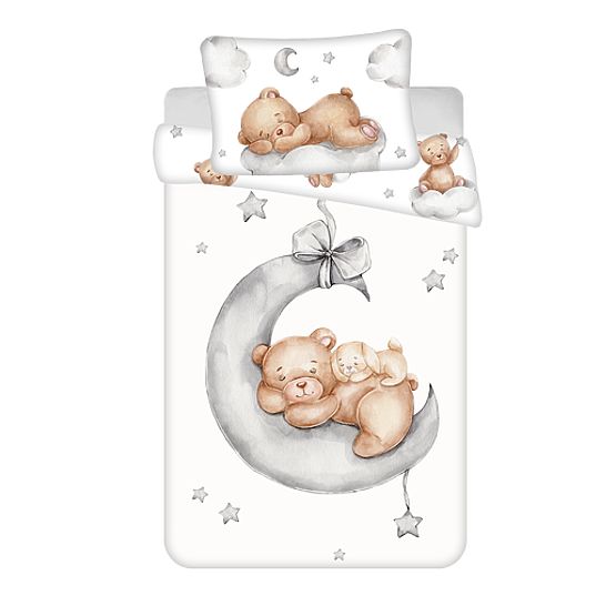 Gönnen Sie Ihrem Baby den sanftesten Schlaf in einer Bettwäsche, die so zart ist wie Ihre Berührung. Der niedliche Bär auf einem sanften Hintergrund schafft eine ruhige und liebevolle Atmosphäre, ideal für die ersten Träume Ihres Kindes. Hergestellt aus weicher und atmungsaktiver Baumwolle, die die empfindliche Babyhaut verwöhnt und maximalen Komfort die ganze Nacht über garantiert.