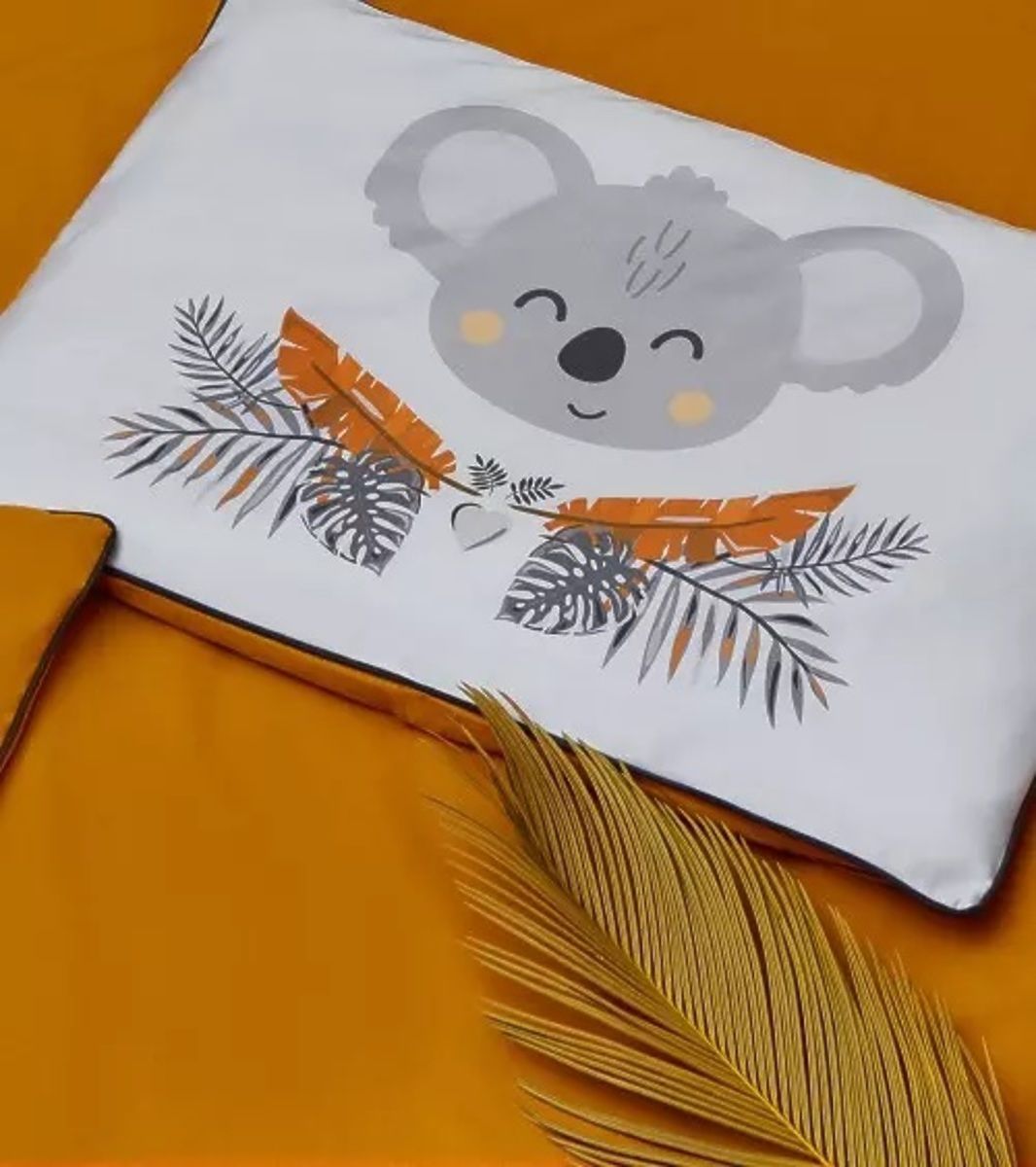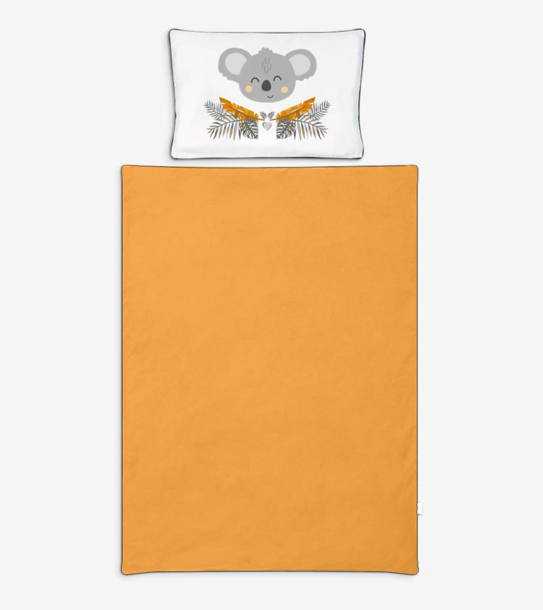 Dank der Baumwollbettwäsche für Kinder von Nature&Love Tropics mit einem wunderschönen Motiv aus Koalas und Blättern auf dem Kissen, kombiniert mit einer senffarbenen Decke, werden Kinderträume viel süßer.