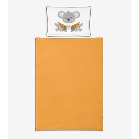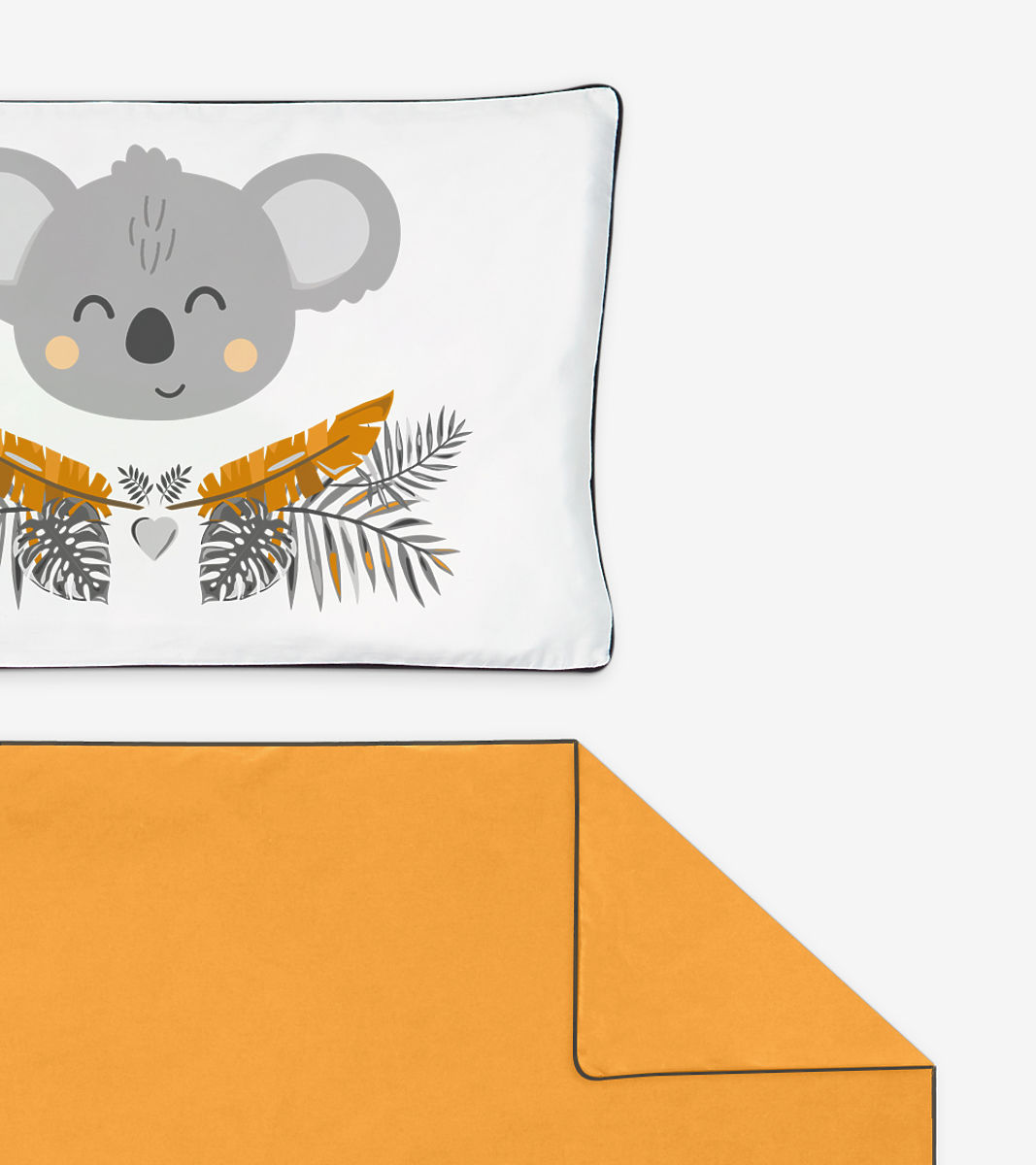 Die Bettwäsche besteht aus einem Bettbezug 135 x 100 cm und einem Kissenbezug 40 x 60 cm . Der Kissenbezug ist doppelseitig , wobei eine Seite des Bezugs aus Baumwollsatin mit Koala-Motiv und die andere Seite aus einem glatten, senffarbenen Stoff besteht. Der Druck auf dem Stoff erfolgt auf ökologische und sichere Weise für Kinder . Die Bezüge werden mit einem praktischen und sicheren Reißverschluss befestigt, was einen schnellen Wechsel der Bezüge erleichtert.