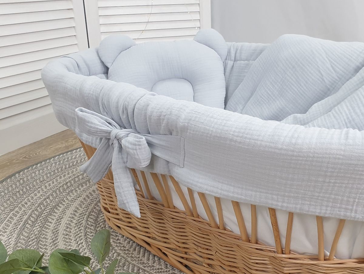 Schönes 4-teiliges Bettwäsche-Set für ein Weidenkinderbett, hergestellt aus weichem Baumwoll-Musselin. Die Haut von Babys ist zart und empfindlich, daher wählen Eltern nur das Beste für ihre Kleinen. Dieses Set ist die perfekte Wahl für den Schlaf Ihrer Kleinen. Die neutrale graue Farbe passt sowohl für Mädchen als auch für Jungen.