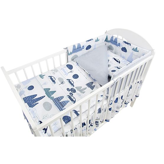 Weiß und Hellblau dominieren auf der Bettwäsche, die wunderbar zusammenpassen. Die Bettwäsche ist auch mit Bäumen und Bergen geschmückt.