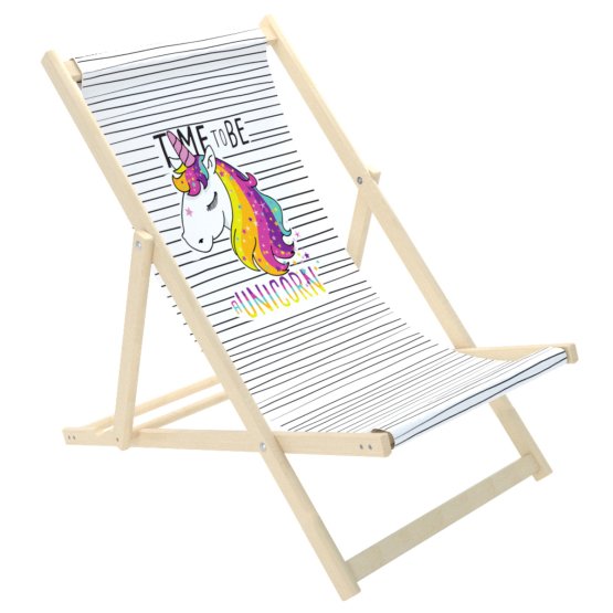 Eine wunderschöne Strandliege mit zauberhaftem Einhornmuster. Der Liegestuhl ist mit einer lustigen englischen Aufschrift „TIME TO BE UNICORN“ verziert. Eine Kinder-Strandliege ist eine tolle Alternative zu einem Gartenstuhl oder Sessel.
