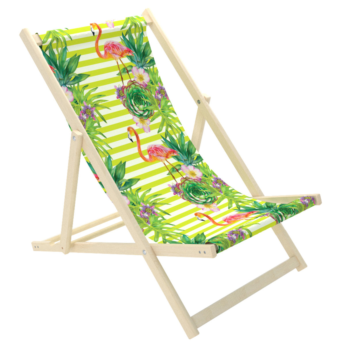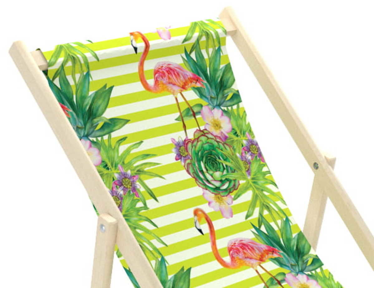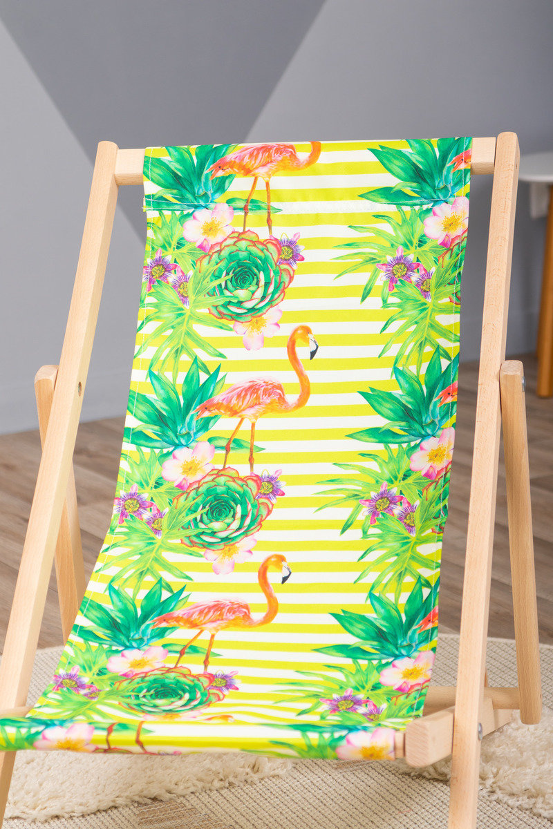 Schöner Strandkorb mit Flamingomuster und tropischen Blumen. Der Stoff hat eine schöne grüne Farbe mit weißen Streifen. Ein Kinderstrandkorb ist eine tolle Alternative zu einem Gartenstuhl oder Sessel.