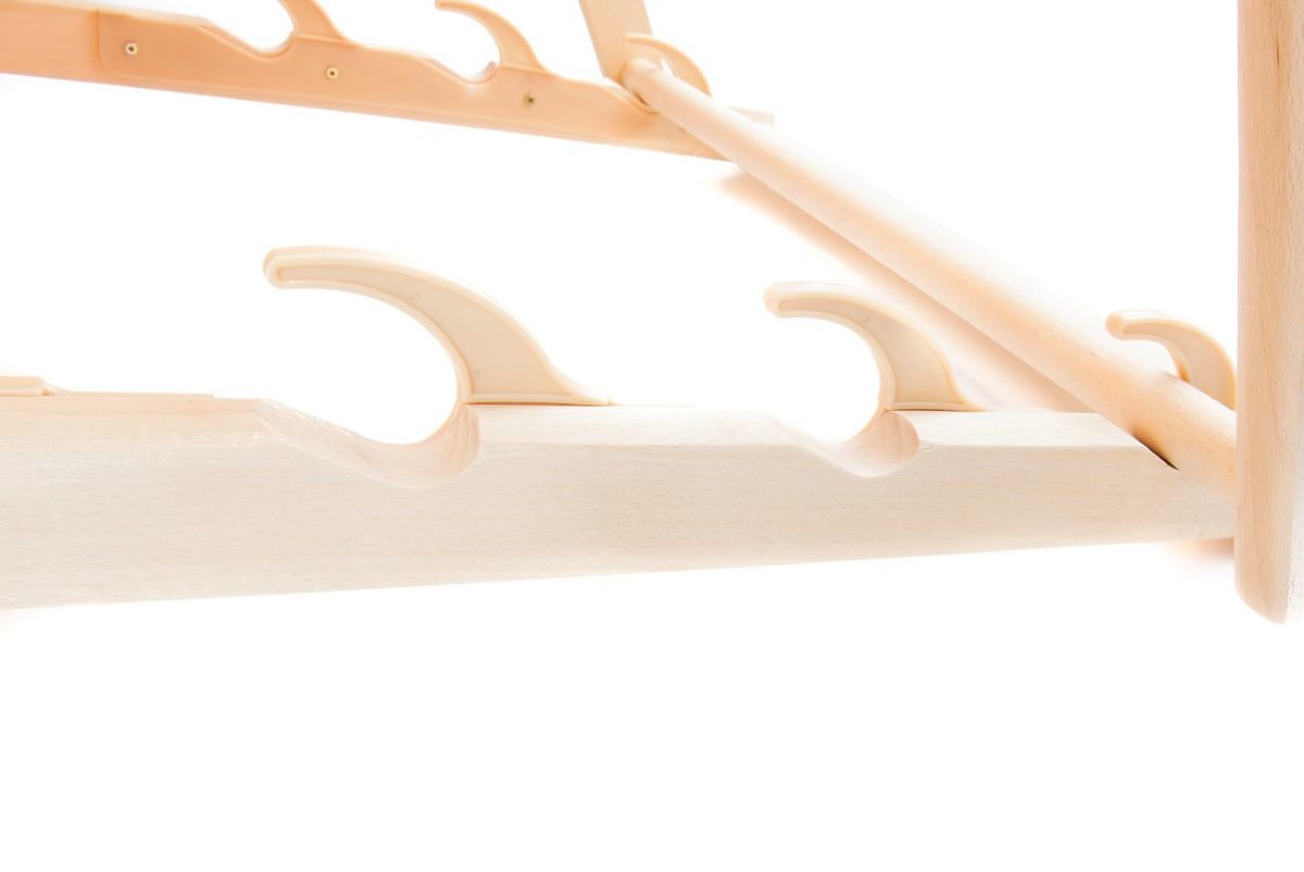 Die Buchenlatten, aus denen die Struktur besteht, sind glatt geschliffen und gefräst, damit Kinder nicht verletzt werden. Die Liege lässt sich einfach und schnell zusammenklappen und transportieren.
