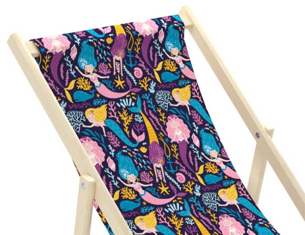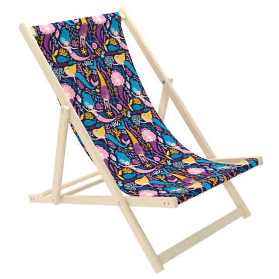Eine wunderschöne Strandliege mit einem Muster aus Meerjungfrauen. Feen haben wunderschöne Kleider in verschiedenen Farben. Eine Kinder-Strandliege ist eine tolle Alternative zu einem Gartenstuhl oder Sessel.