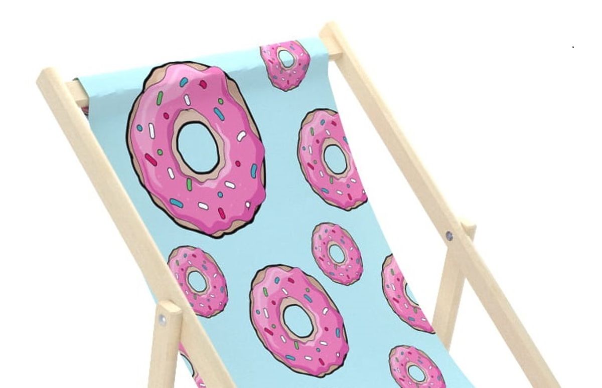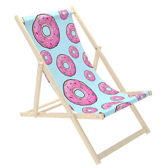 Schöner blauer Strandkorb mit einem Muster der amerikanischen Donuts mit rosa Zuckerguss und bunten Streuseln. Das süße Donut-Motiv der Liege ist perfekt für sommerlichen Komfort. Der Liegestuhl ist für das Meer und den Garten geeignet. Ein Strandkorb für Erwachsene ist eine großartige Alternative zu einem Gartenstuhl oder Sessel.