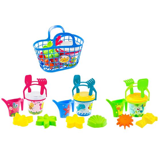Sandspielzeug-Set mit Gießkanne, Eimer und Förmchen im tragbaren Korb. .. mehr