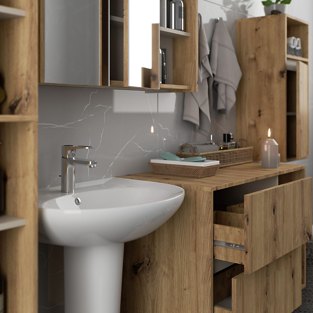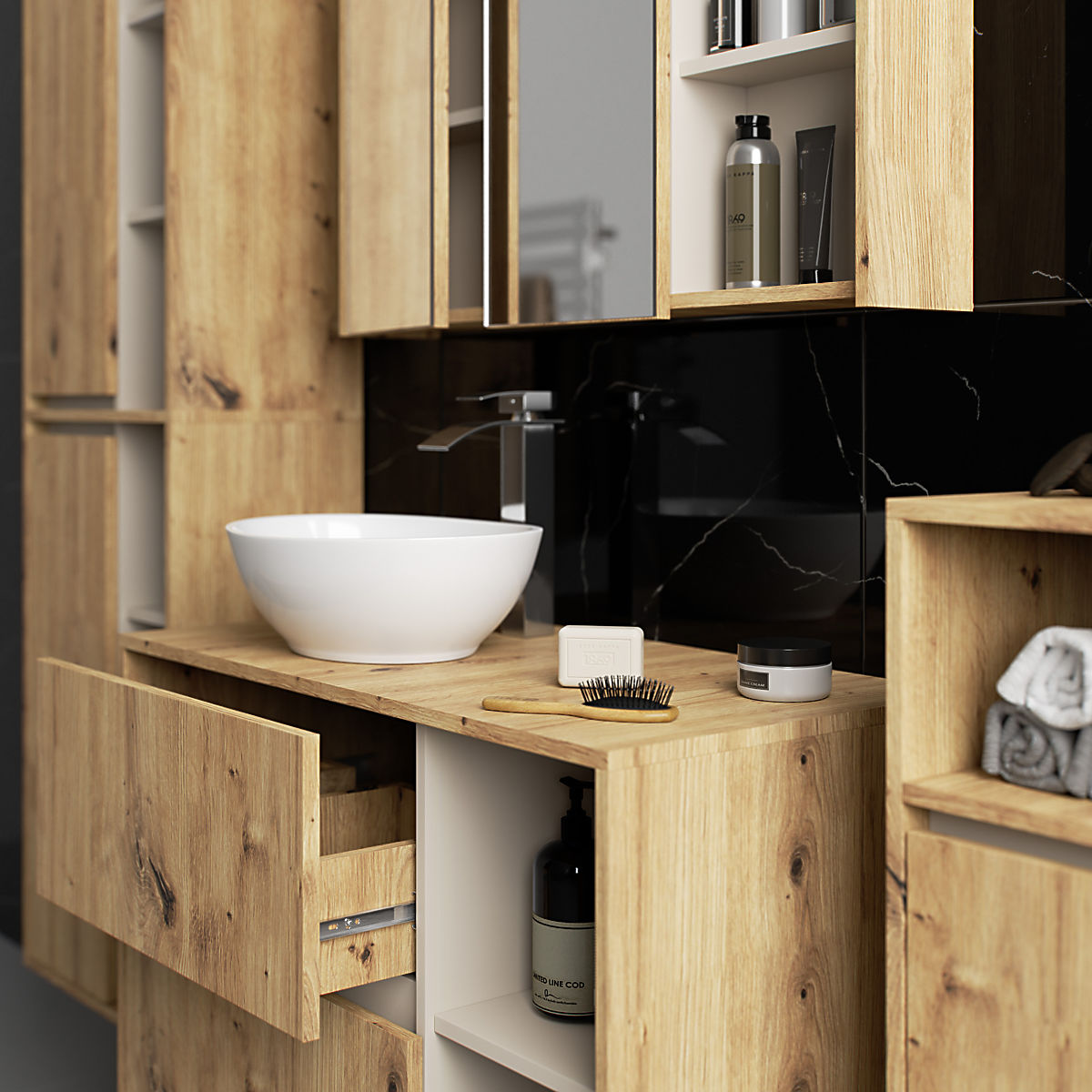 Badezimmerschränke ergänzen die Badezimmereinrichtung hervorragend, bieten den notwendigen Platz für alle Kosmetika und Reinigungsmittel und verleihen dem Badezimmer einen gewissen Stil. Geräumige Schränke erleichtern die Ordnung im Raum, was sich positiv auf die Ästhetik des Innenraums auswirkt. Die VAMI-Kollektion zeichnet sich durch eine auffällige stilvolle Farbgebung aus – sowohl der Korpus als auch die Fronten haben die gleiche Farbe, während die Innenfarbe unterschiedlich ist.