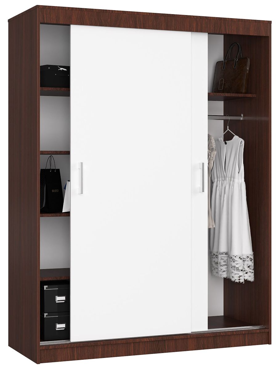 Welche Schränke sind beliebt? Diejenigen, die geräumig und funktional sind und gleichzeitig ästhetisch ansprechend. Diese Bedingungen erfüllt der Schiebetür-Schrank 150 cm CLP in Wenge und Weiß aus unserem Angebot. Er ist für zwei Personen geeignet. Passt hervorragend ins Schlafzimmer, Wohnzimmer oder Ankleidezimmer. Er kann nicht nur Kleidung, sondern auch Textilien aufbewahren. Es ist ein geräumiges Möbelstück, das hilft, Ordnung im Raum zu halten.