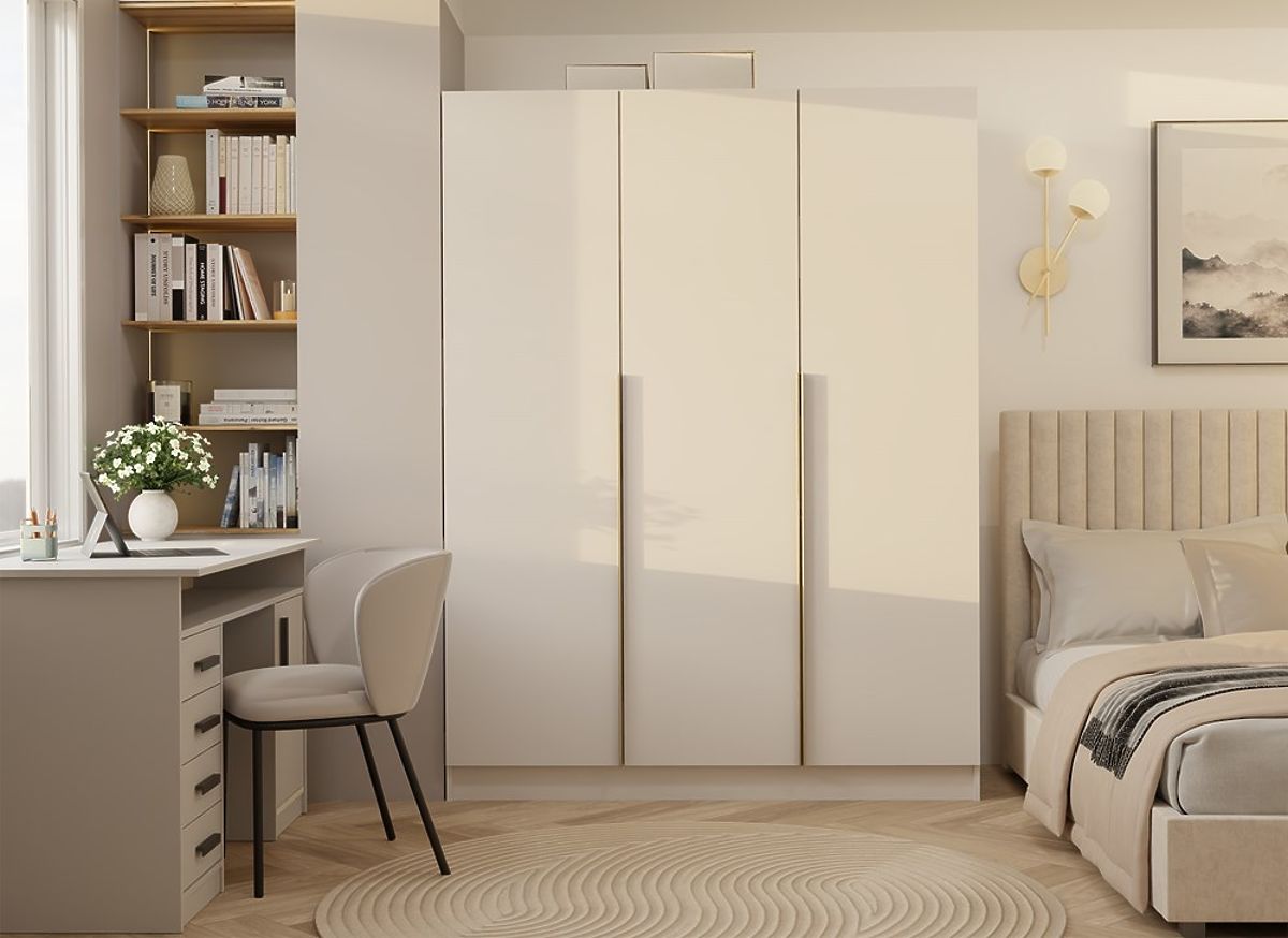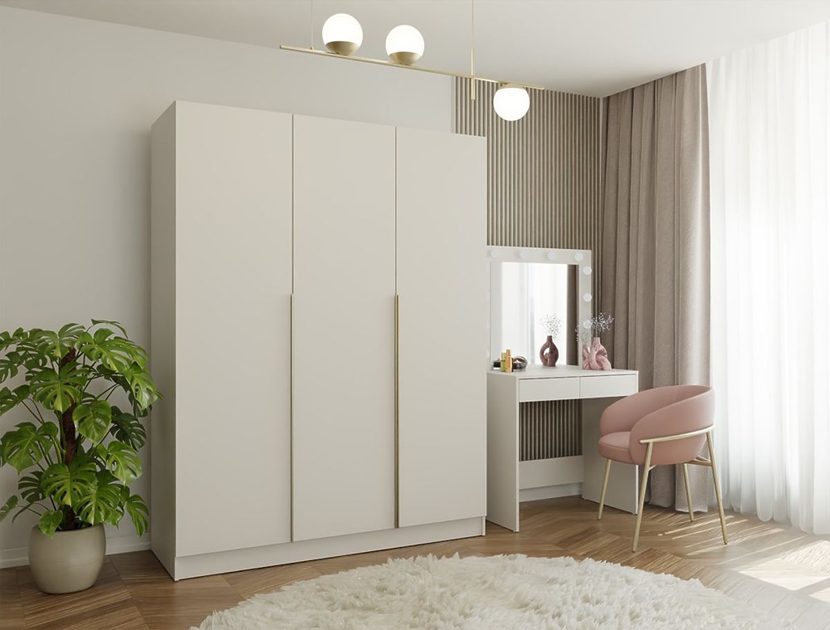 Banaby.at   »   Kindermöbel   /   Kinderkommoden und Schränke   /   Kinderkleiderschränke   /   SCHRANK SENSO 3D 150 CM 3 TÜREN GOLDENE GRIFFE FÜR WOHNZIMMER SCHLAFZIMMER KASCHMIR BEIGE