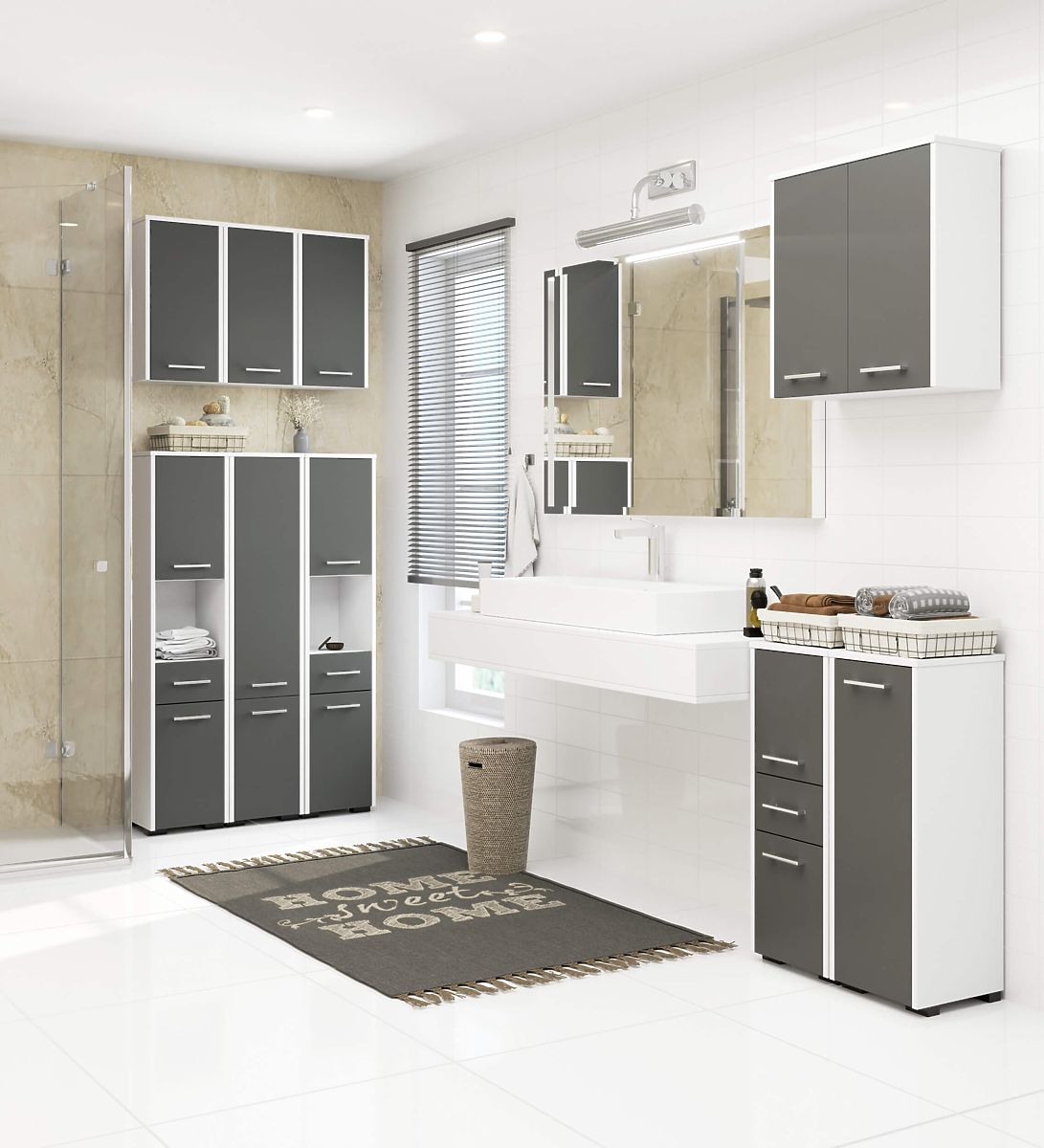 Stehender Badezimmerschrank FIN S 30 cm in Weiß und Graphitgrau. .. mehr
