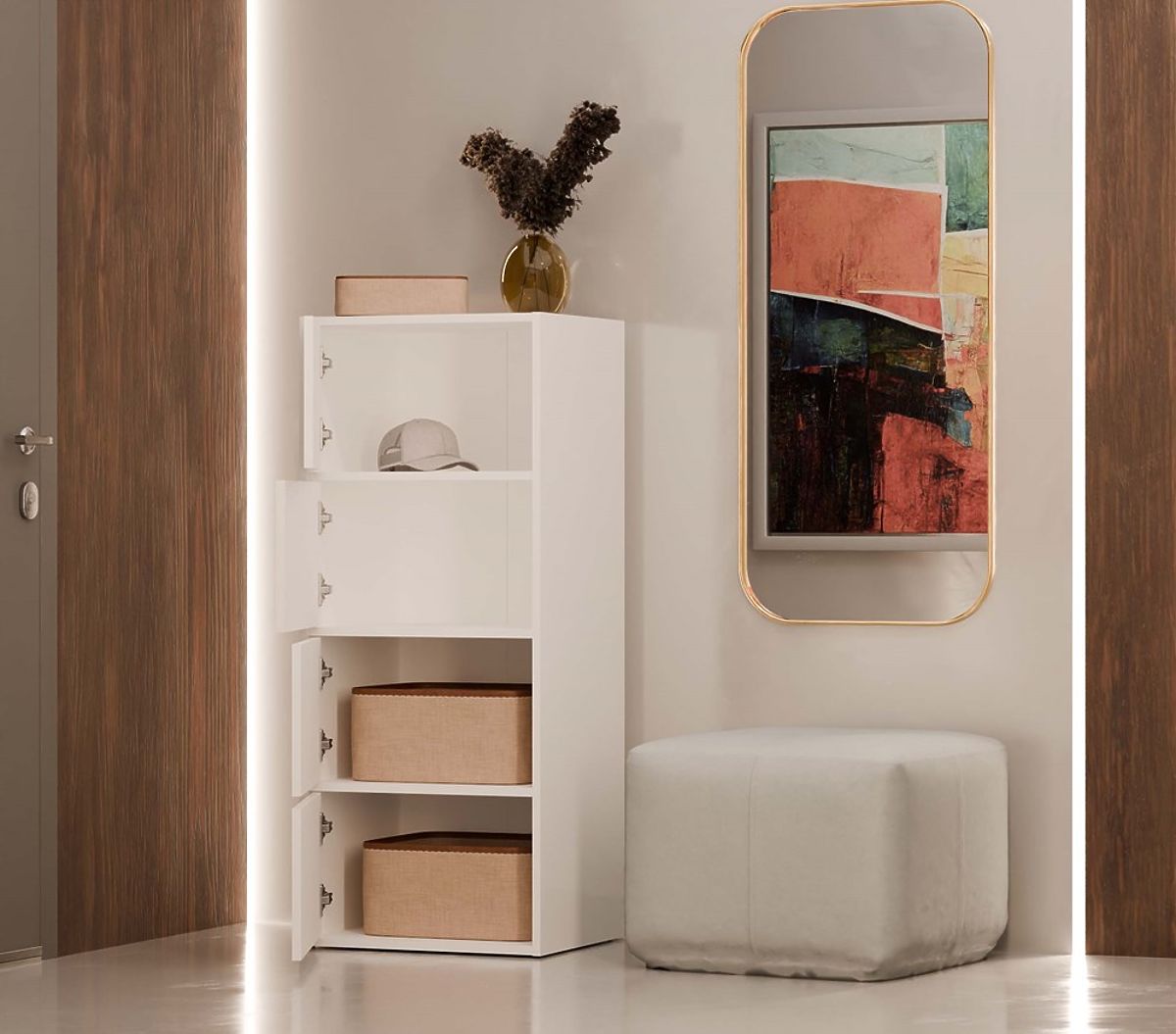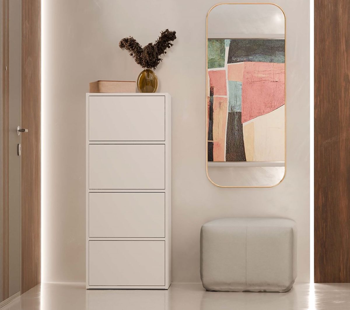 Dank der geräumigen Regale, die sich hinter den glatten Türen verbergen, bietet die Kommode viel Stauraum und erleichtert die Ordnung in jedem Raum.