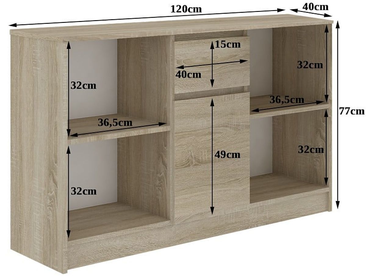 Die Möbelmaße betragen 120 cm x 77 cm x 40 cm. Alle Personen, die eine attraktive, qualitativ hochwertige, aber auch preisgünstige Option für die Einrichtung eines Raumes suchen, laden wir ein, sich mit diesem interessanten Angebot näher vertraut zu machen. Wir hoffen, dass es auch die Erwartungen der anspruchsvollsten Personen erfüllt. Die Kommode besteht aus zwei offenen Regalen, einem hinter einer Tür und einer Schublade. Das Ganze präsentiert sich sowohl einzeln als auch in Kombination mit anderen Möbeln aus dieser Serie wunderschön. Wir laden Sie zum Kauf ein.