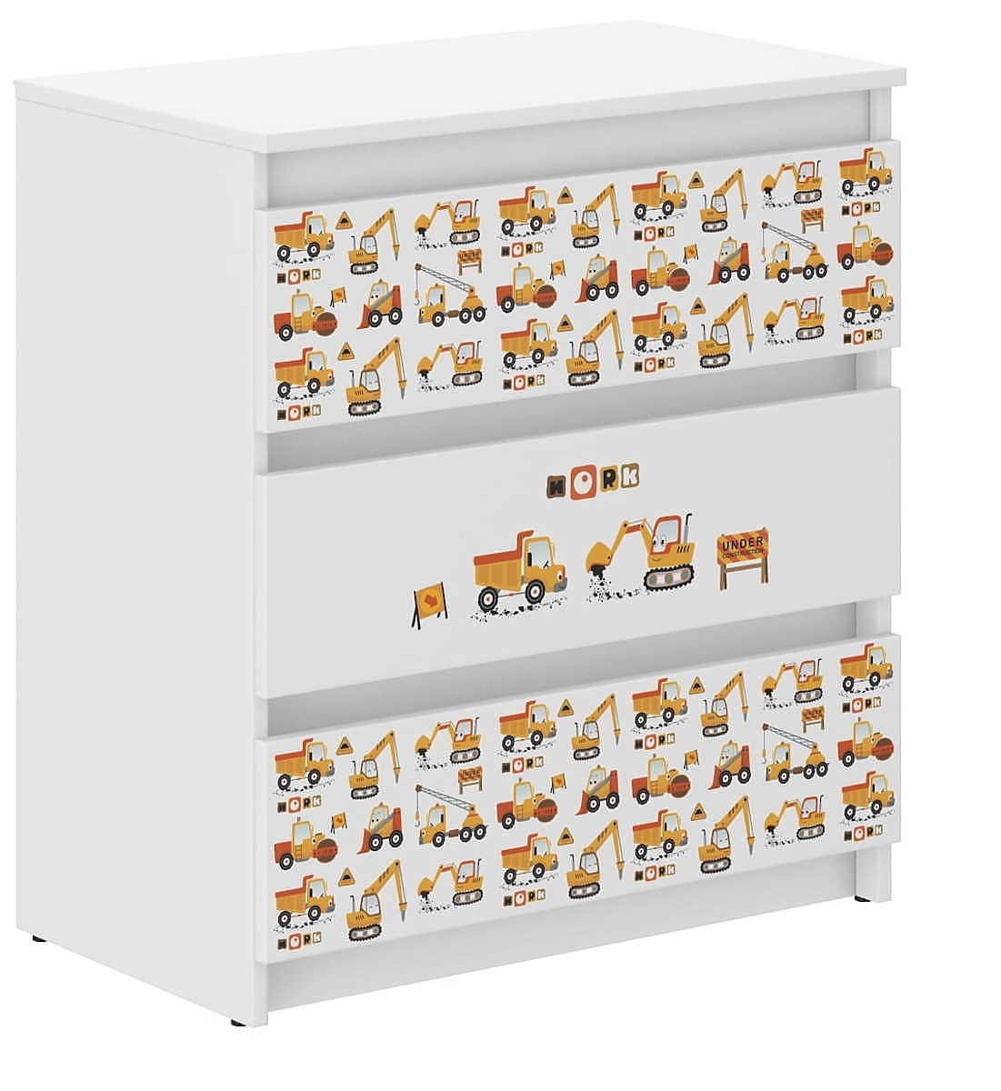 Weiße Kommode mit Baumaschinenmotiv und drei geräumigen Schubladen. .. mehr
