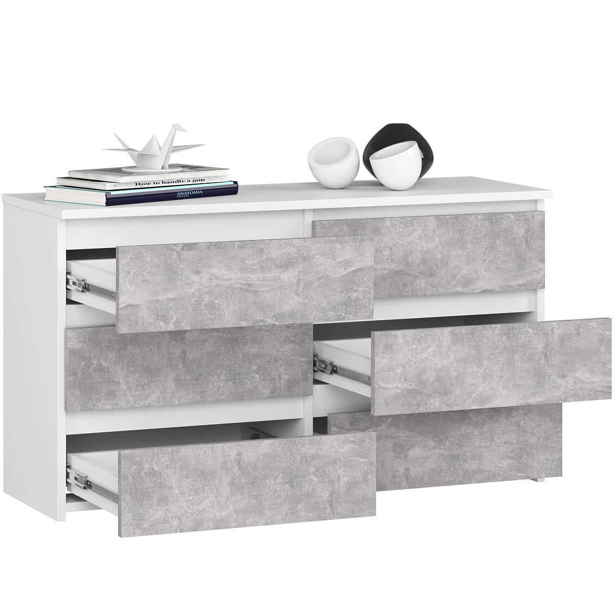 Im Möbelbau wird besonderer Wert auf die Funktionalität der Produkte und ihre hohe ästhetische Qualität gelegt. Ein hervorragendes Beispiel ist die Kommode CL 100 cm. Dieses praktische Möbelstück ist aus abriebfester laminierter Platte gefertigt, was seine Langlebigkeit und Widerstandsfähigkeit garantiert. In den sechs geräumigen Schubladen finden verschiedene Bücher, Dokumente oder Kleinigkeiten Platz. Einige unserer Kunden entscheiden sich dafür, Kleidung oder Unterwäsche zu verstauen. Die weiße Kommode mit Betonfronten hat ein elegantes Design. Die schlichte Form und das elegante Finish passen sowohl in klassische und elegante als auch in romantische Interieurs. Dieses außergewöhnliche Möbelstück präsentiert sich perfekt im eleganten Wohnzimmer und im gemütlichen Schlafzimmer. Es wird auch häufig als Teil eines Kleiderschranks oder Flurs verwendet. Die Kommode mit 6 Schubladen wird von Einzelkunden und Unternehmern geschätzt. Dank ihres makellosen Aussehens und ihrer außergewöhnlichen Kapazität eignet sie sich hervorragend als Teil der Büroausstattung.