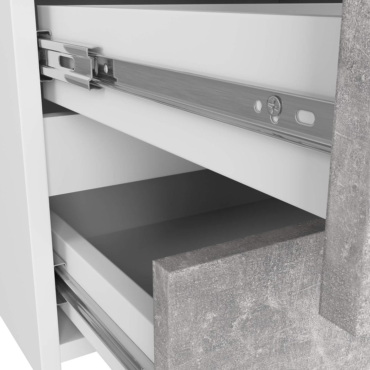 - Schubladen laufen auf Metallkugelführungen - Kanten mit ABS-Kante beklebt für hohen Schutz gegen Beschädigungen