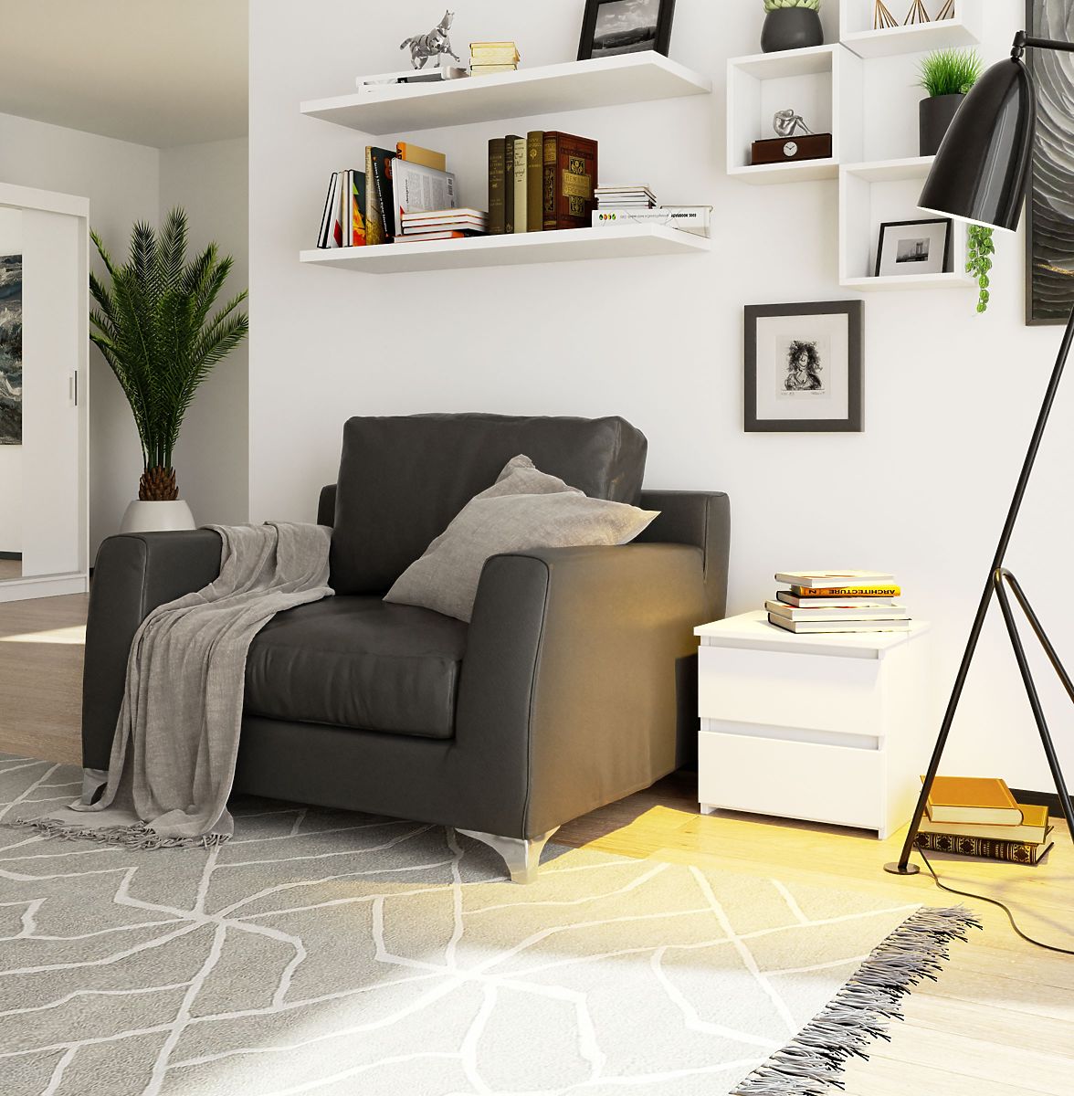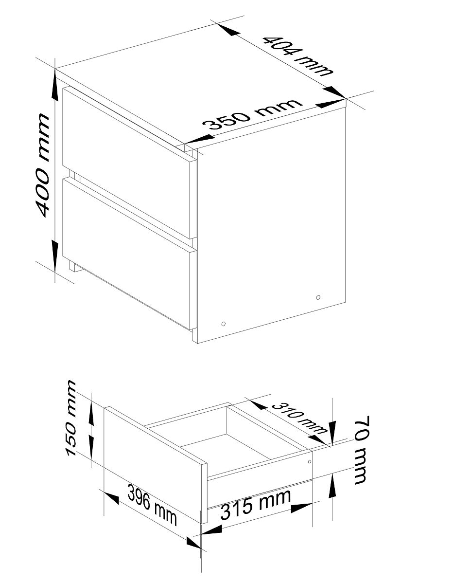 Der Nachttisch ist eines der grundlegenden Möbelstücke im Schlafzimmer. Der Nachttisch ist weiß und besteht aus einer 16 mm dicken laminierten Platte, die zusätzlich abriebfest ist. Die Fronten und Seiten des Nachttisches sind mit einer ABS-Kante versehen, die einen besseren Schutz gegen kleine mechanische Beschädigungen wie Kratzer bietet. Er verfügt über zwei geräumige, grifflose Schubladen, in denen alle notwendigen Gegenstände Platz finden, die griffbereit sein sollten. Der Tisch hat die Maße 40 cm in der Länge, 40 cm in der Höhe und 35 cm in der Tiefe. Die Schubladen sind mit Metallrollenführungen ausgestattet, die bei Bedarf leicht herausgenommen und gereinigt werden können. Dank des universellen Designs und der Farbe passt er in jedes Schlafzimmer und kann erfolgreich mit anderen Möbelstücken aus dem CLP-System kombiniert werden. Das moderne und zugleich minimalistische Design ermöglicht eine einfache Integration in viele Einrichtungsstile. Die Platte ist groß genug, um sowohl eine Nachttischlampe als auch kleine Dekorationen oder ein Buch aufzunehmen.