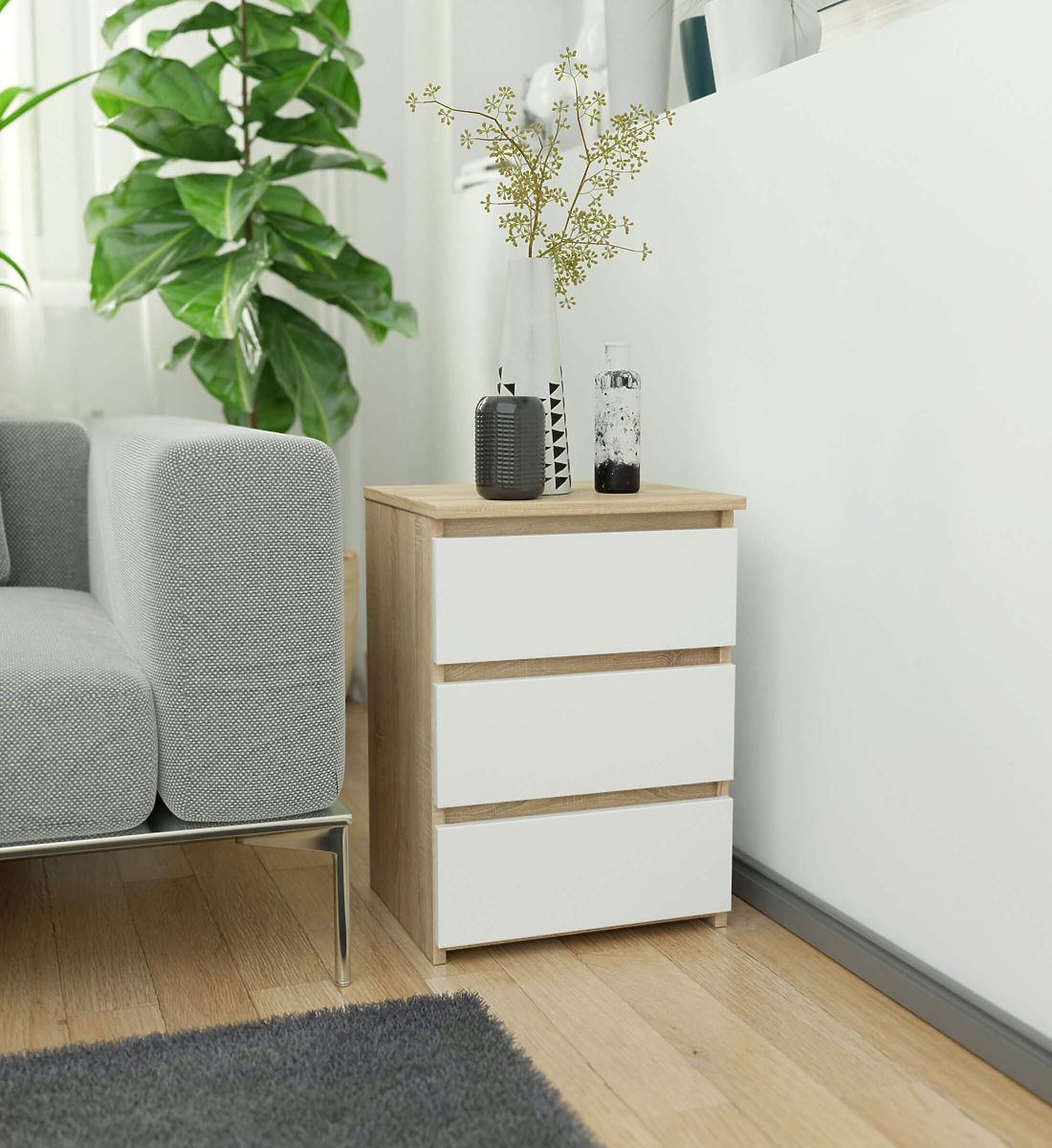Nachtkommoden sind eine beliebte Möbelart, die neben dem Bett platziert wird. Auf der Platte befindet sich meist eine Lampe, während im Inneren Gegenstände aufbewahrt werden, die Entspannung und Schlaf erleichtern. Personen, die nach einer eleganten Kommode suchen, sollten auf den Nachttisch CL3 40 cm in der Farbe Eiche Sonoma mit weißen Fronten achten. Er wird in jedem Schlafzimmer wunderschön zur Geltung kommen. Er kann auch im Kinderzimmer platziert werden.