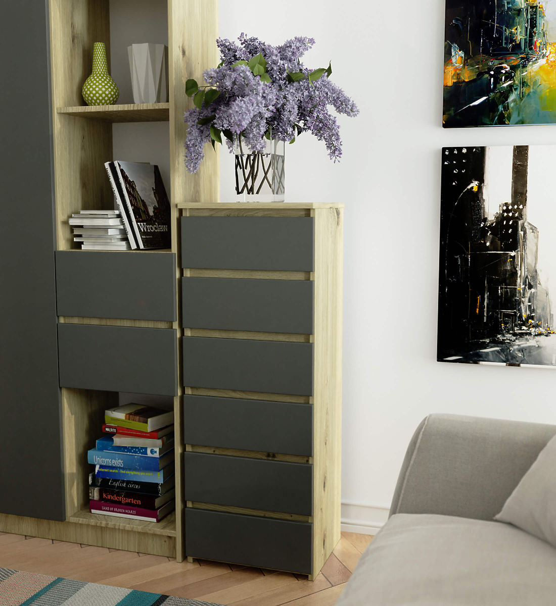 Kommoden sind ein beliebter Möbeltyp, der neben dem Bett platziert wird. Auf der Platte befindet sich meist eine Lampe, während im Inneren Gegenstände aufbewahrt werden, die Entspannung und Schlaf erleichtern. Personen, die eine elegante Kommode suchen, sollten auf die Kommode CL6 40 cm in der Farbe Eiche Artisan mit grauen Fronten achten. Sie wird in jedem Schlafzimmer schön zur Geltung kommen. Sie kann auch im Kinderzimmer platziert werden.